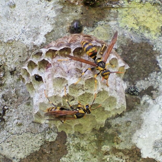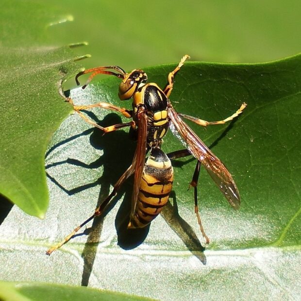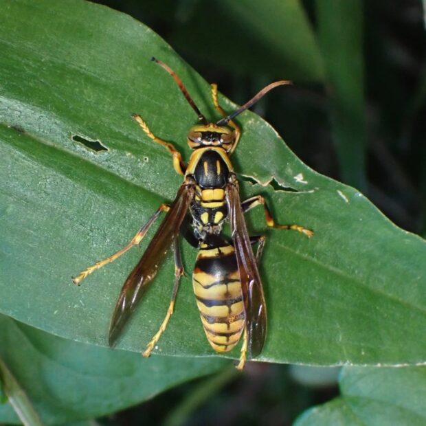 黄色っぽい大型のアシナガバチ。 女王バチは、 樹木の枝や葉の裏に、 4月頃から巣を作り始め、 6月頃に働きバチがあらわれます。 だんだん巣が大きくなり、 夏の終わり頃、 新女王バチとオスバチがあらわれます。