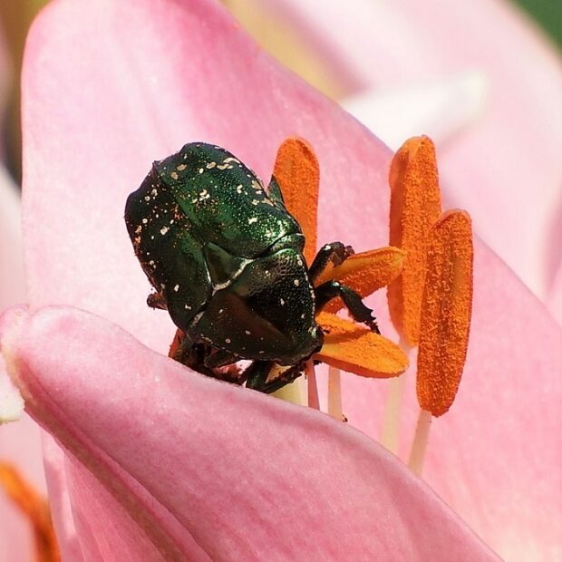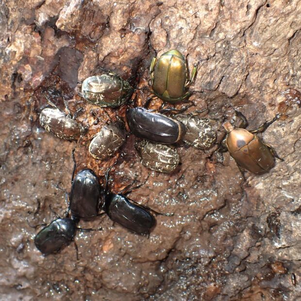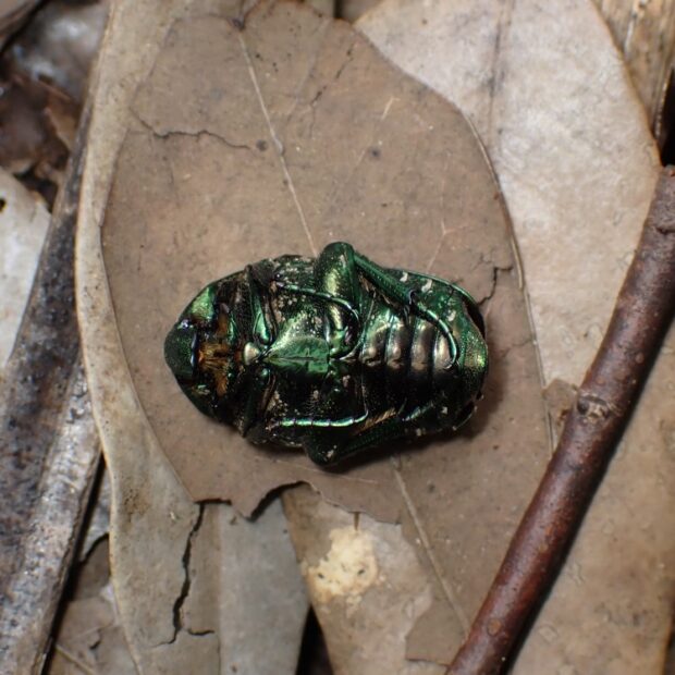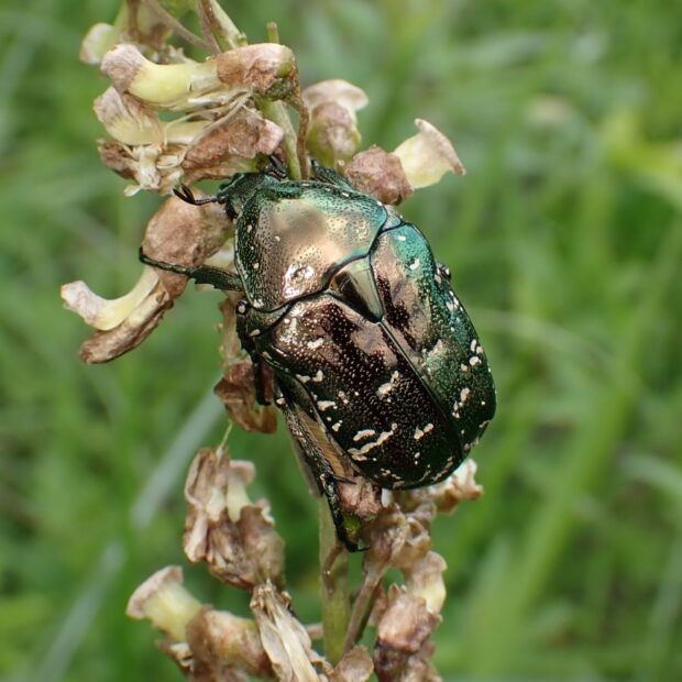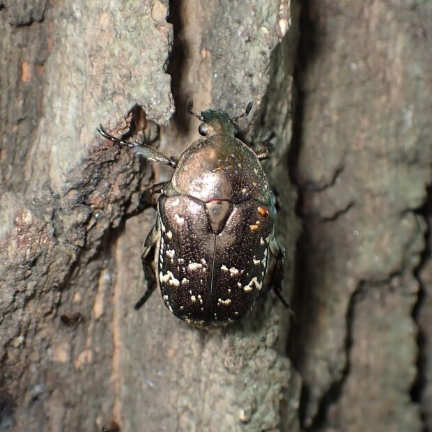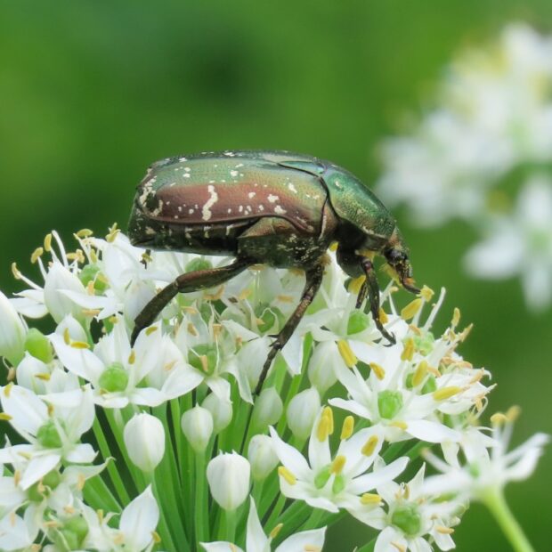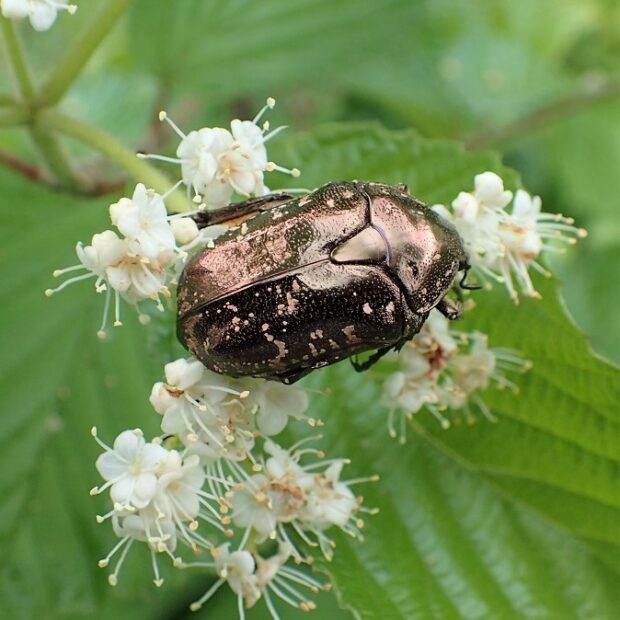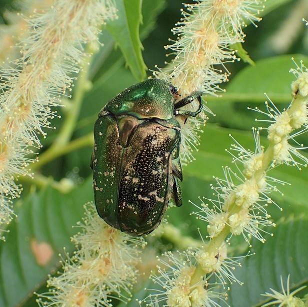 コガネムシの仲間。 街中の公園でも見られ、 さまざまな花や樹液にやって来ます。 畑のトマトやトウモロコシなども好物です。 ハナムグリやカナブンの仲間は、 上翅(じょうし)をたたんだまま、 後ばねだけ広げて飛ぶことができます。