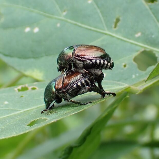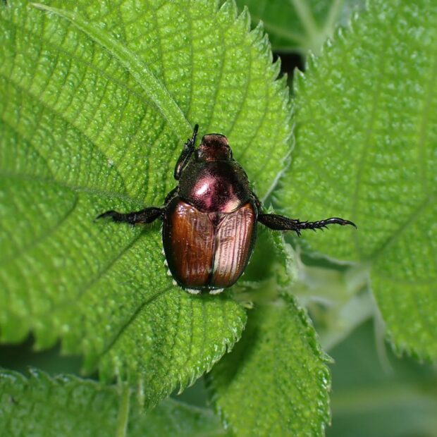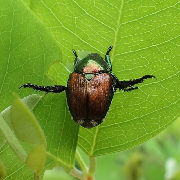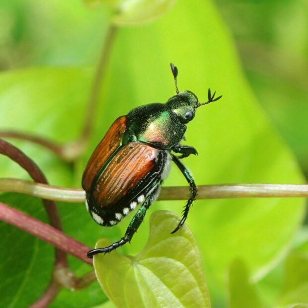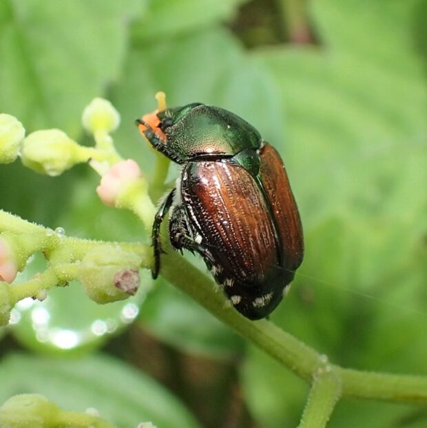 胸が緑色で、 上翅(じょうし)が茶色~緑色の小さなコガネムシ。 街中の公園、 人家周辺、 畑などで普通に見られ、 マメ科の植物などいろいろな葉や花を食べます。 アメリカにも侵入し、 「ジャパニーズ・ビートル」と呼ばれています。