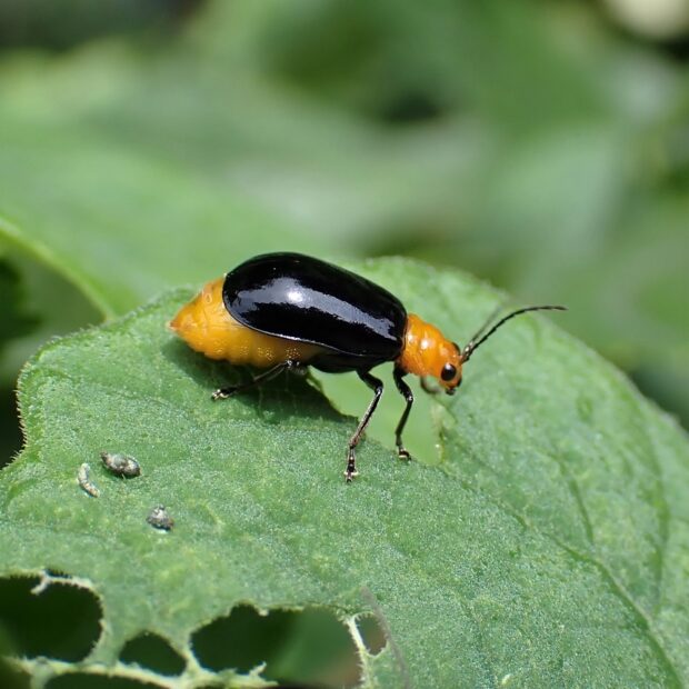 頭と前胸がオレンジ色で、 上翅とあしが黒いヒゲナガハムシの仲間。 公園、 草はら、 畑などで、 普通に見られます。 カラスウリ類の葉を好み、 葉を丸く傷をつけてから、 中の葉を食べます。 この食べ方は植物が出す苦みや粘りを遮断すると言われています。