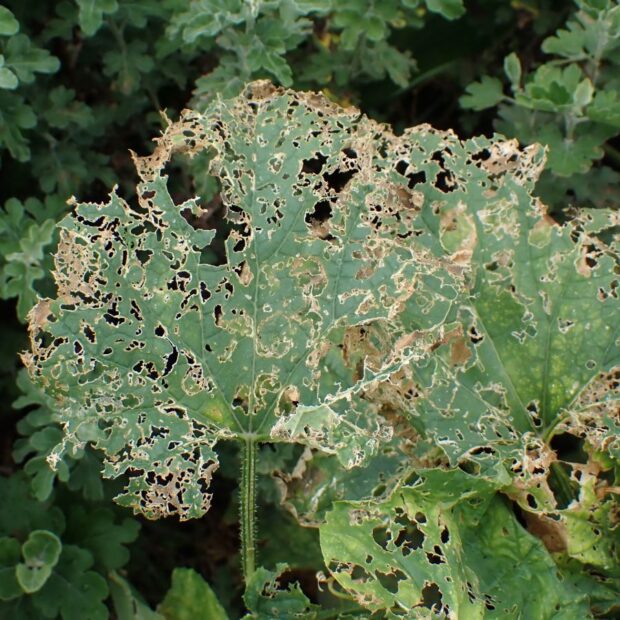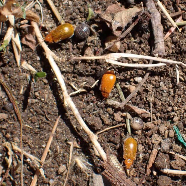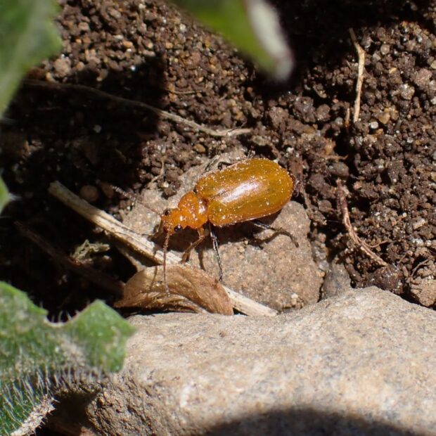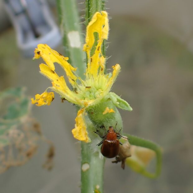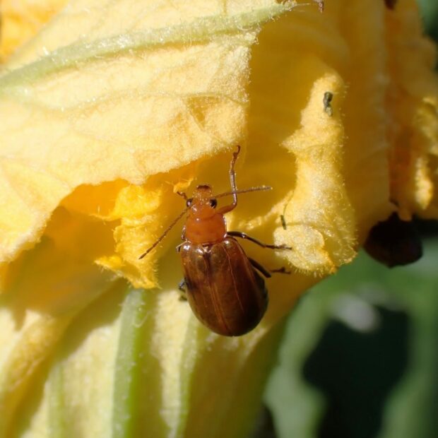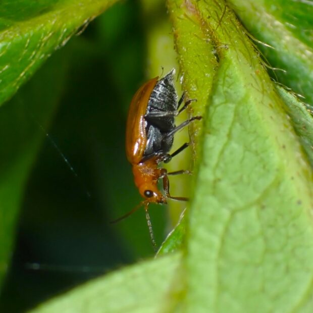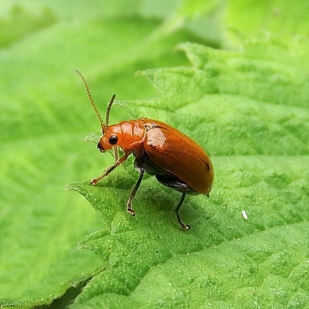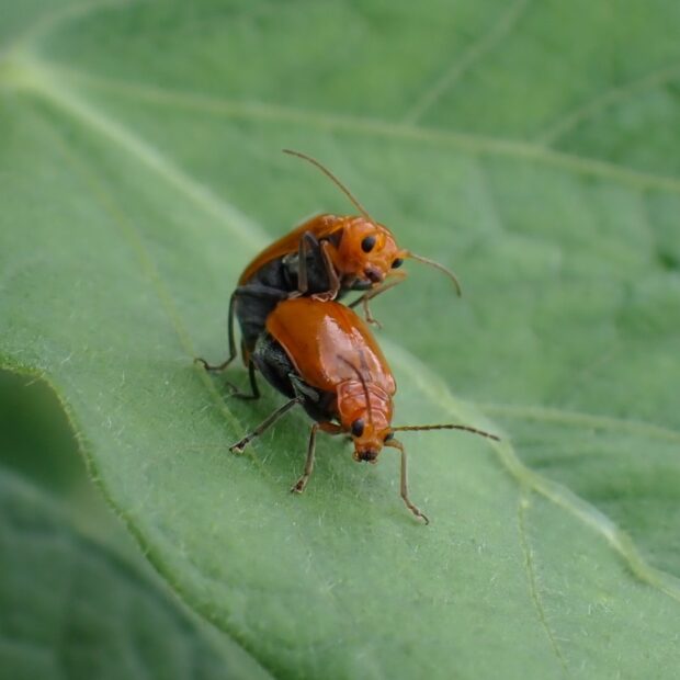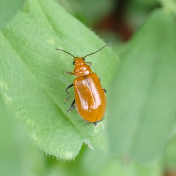 草地や公園などで普通に見られるオレンジ色のハムシ。 畑のキュウリやスイカなどウリ科植物の葉を食べますが、 ウリ科以外の野菜も食べることがあります。 幼虫は土の中で根を食べて育ち、 土の中で蛹になります。
