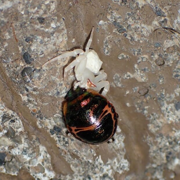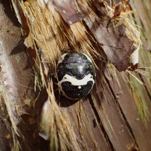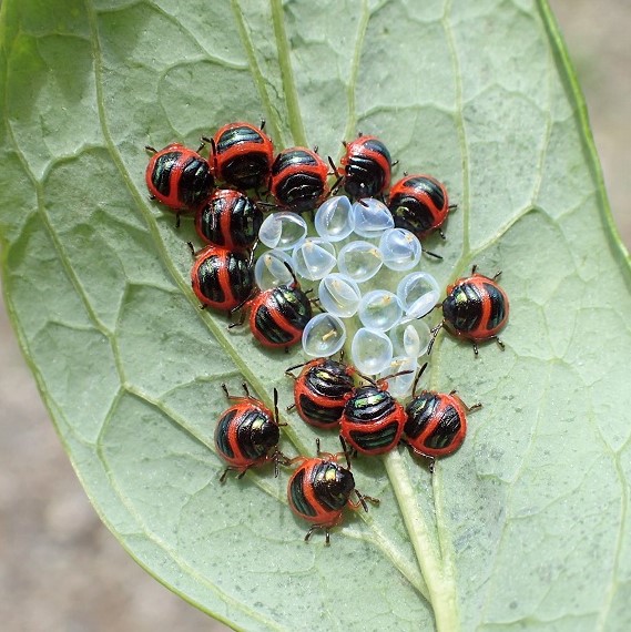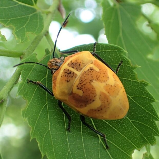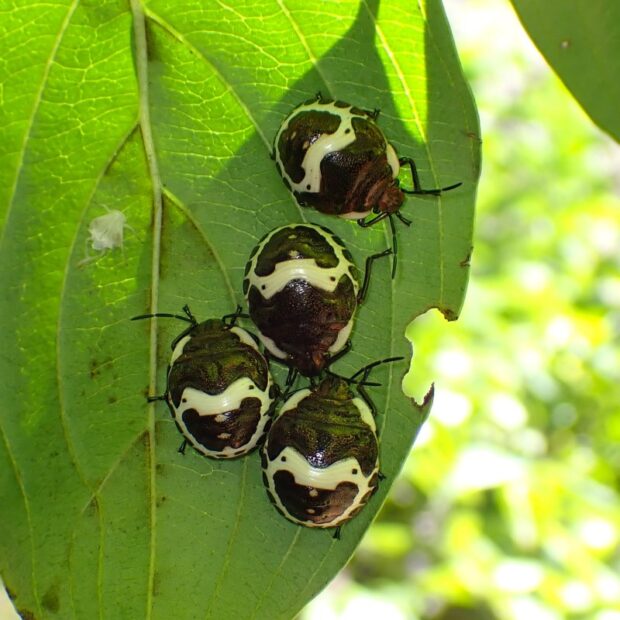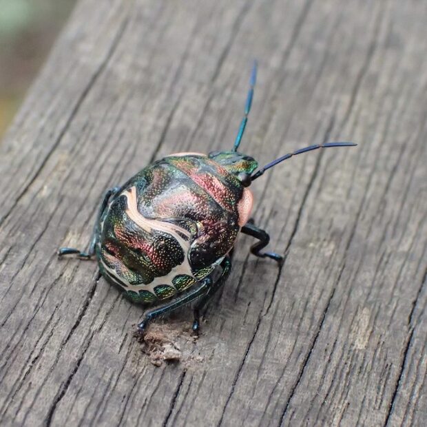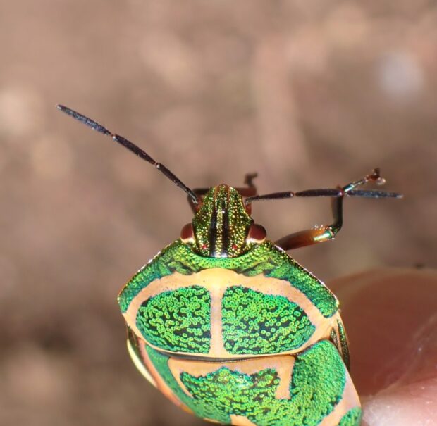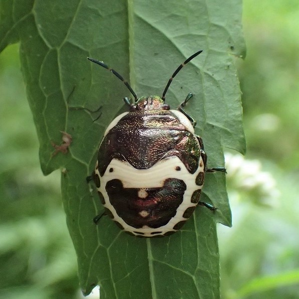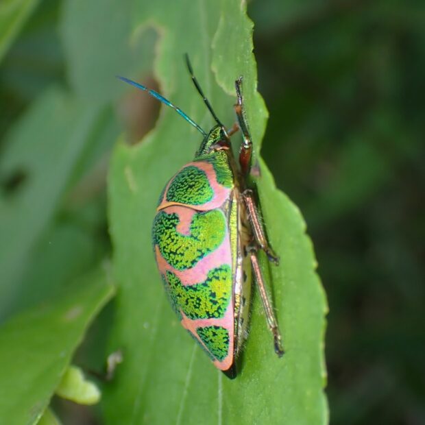 緑色にピンクっぽい模様のある美しいカメムシ。 「歩く宝石」とも呼ばれ人気があります。 終齢幼虫で越冬し、 5月頃成虫になります。 ミズキなど様々な木で見られます。
