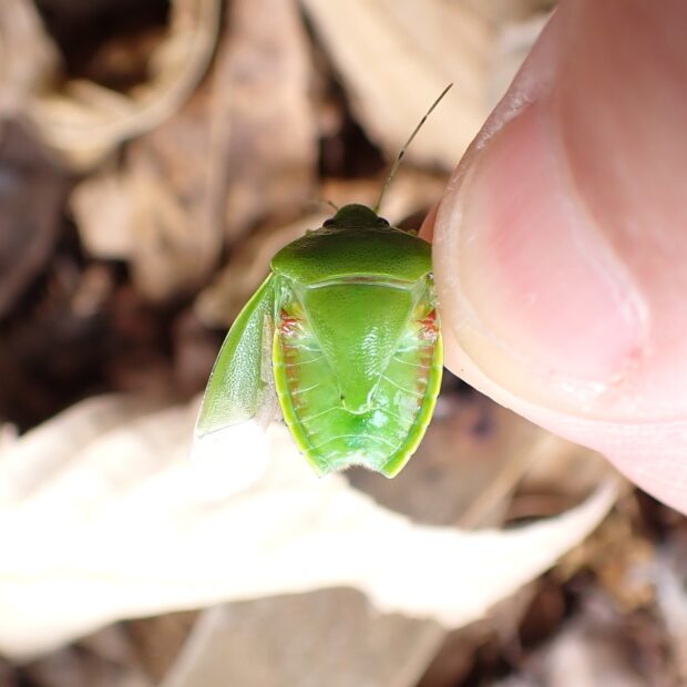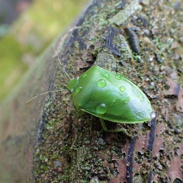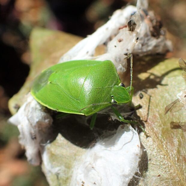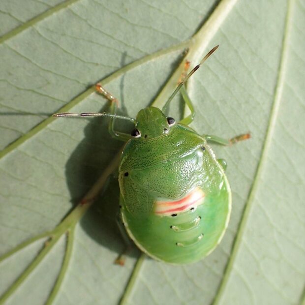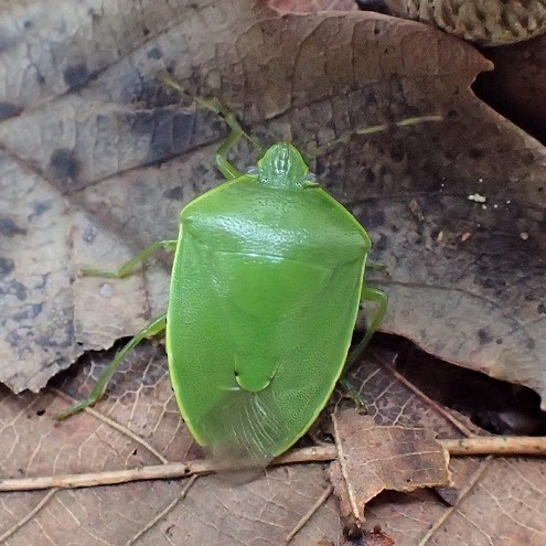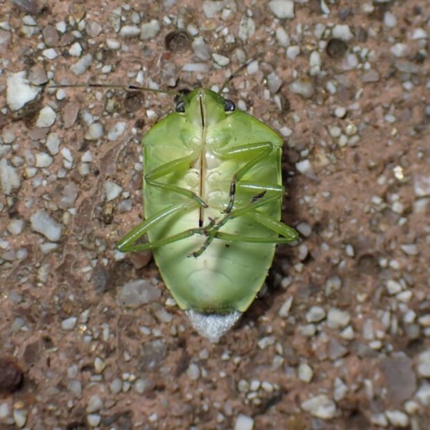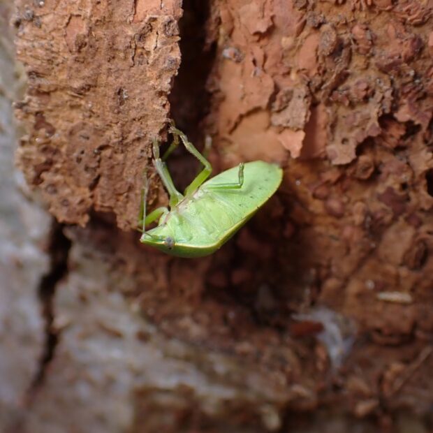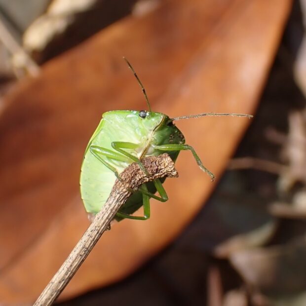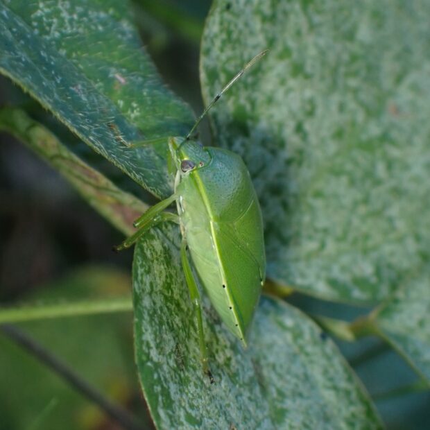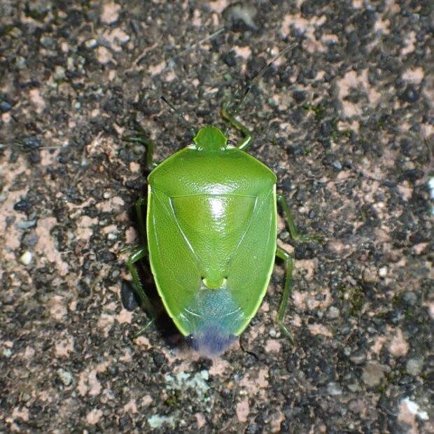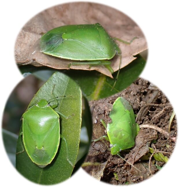 丸みを帯びた緑色でツヤのある南方系のカメムシ。 幼虫は主にスギやヒノキの実を吸って成長し、 成虫はかんきつ類やカキ、 モモなど果物によくやってきます。 光に集まる習性があります。 年によって発生量に波があり、 大量発生する年があります。