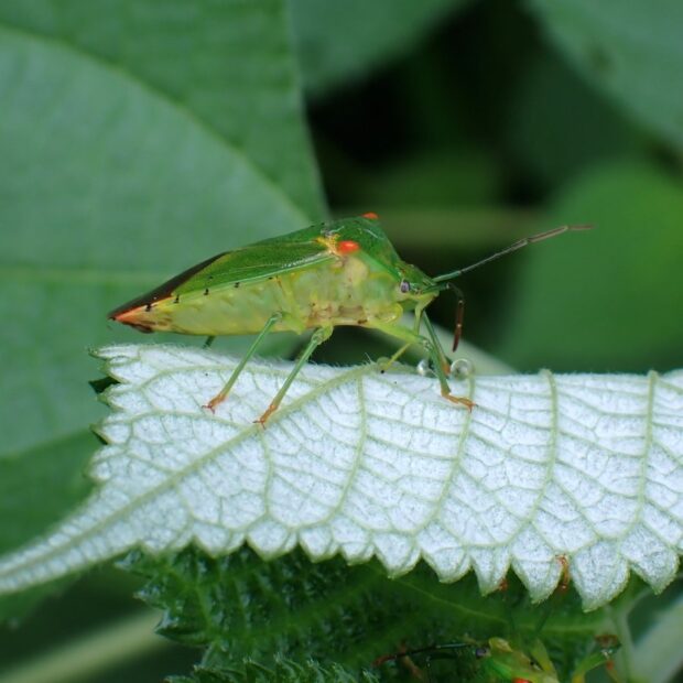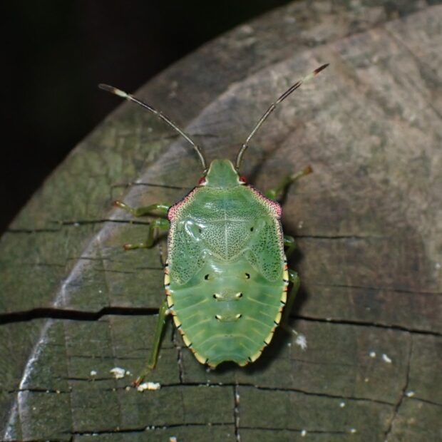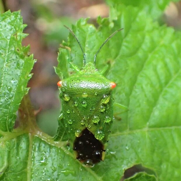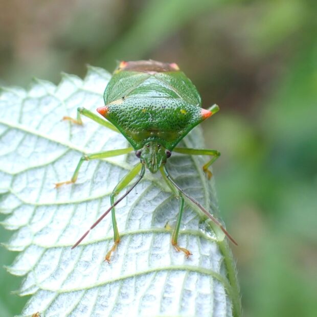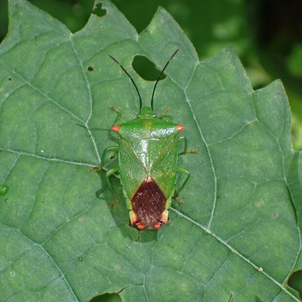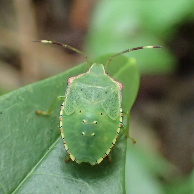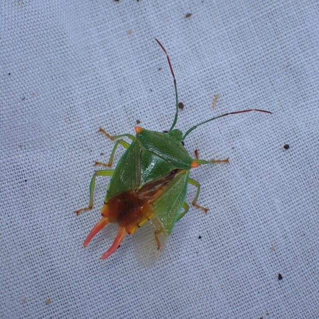 鮮やかな緑色で、 肩がオレンジ色のツノカメムシ。 オスはお腹の先端に、 オレンジ色の平行に伸びた突起があります。 交尾のとき、 メスをはさんで逃がさないようにすると言われています。 メスには長い突起がありません。