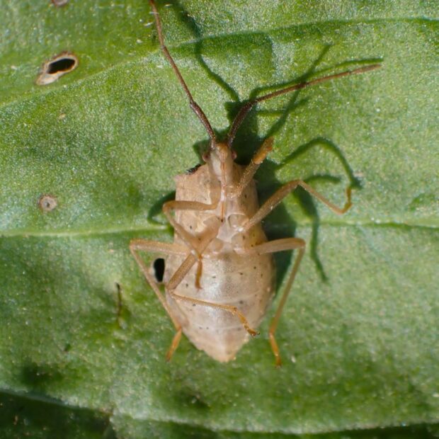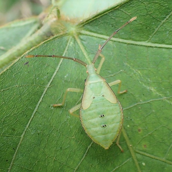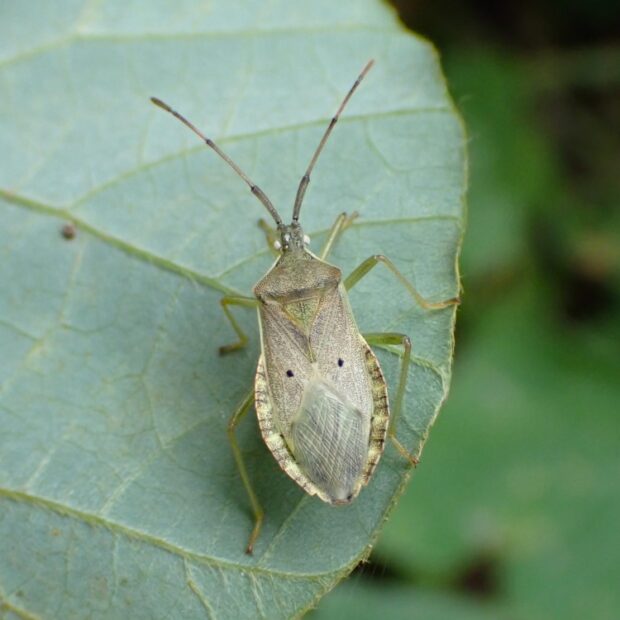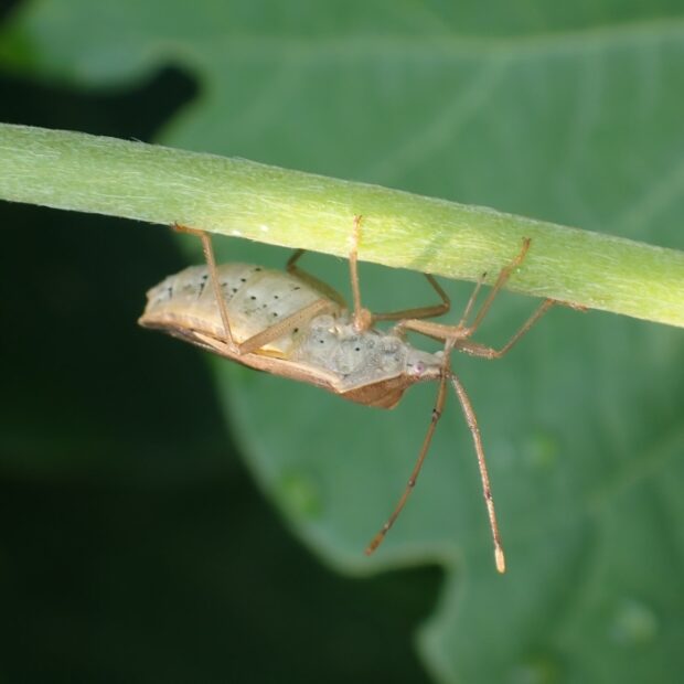 うす茶色の体に小さな黒い点が2個あるカメムシ。 都市周辺の草地などで普通に見られ、 マメ科の植物、 特にクズを好みます。