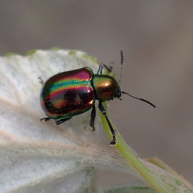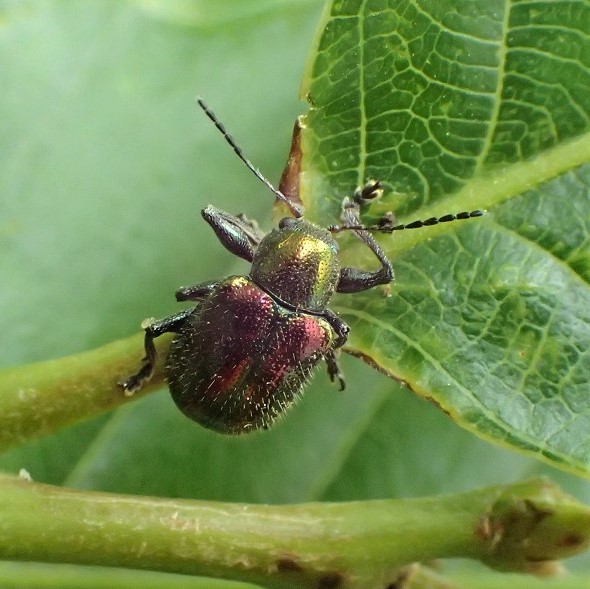 ピカピカに輝く金属光沢のある美しいハムシ。 胸は緑色、 上翅(じょうし)は赤色と緑色。 林縁のノブドウ、 エビヅルなどブドウ類の葉で見られます。 産卵は食草の根もとに行い、 幼虫は地中で根を食べます。