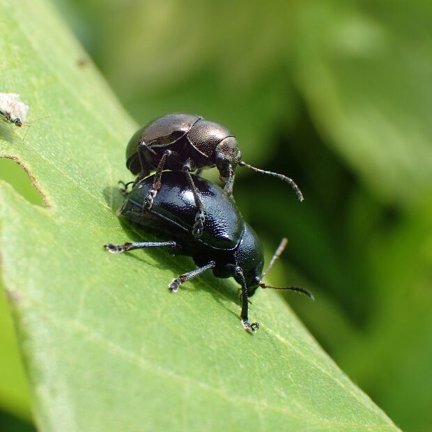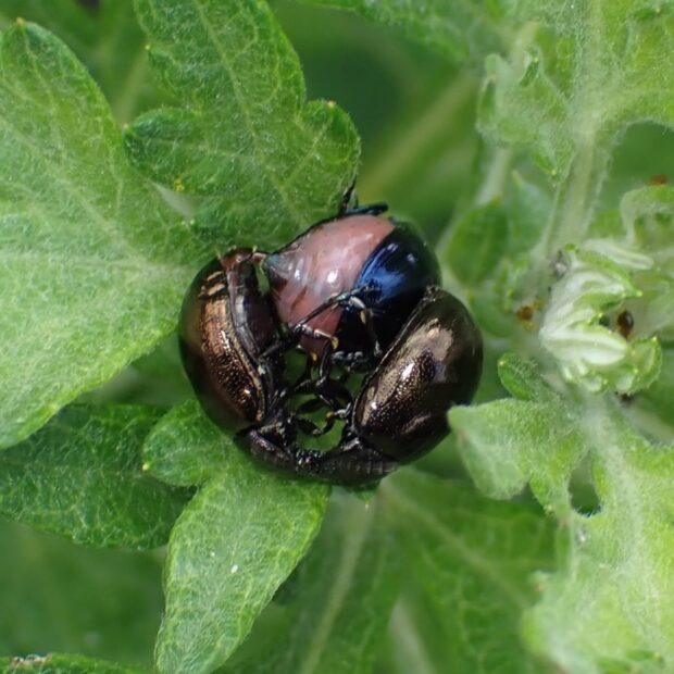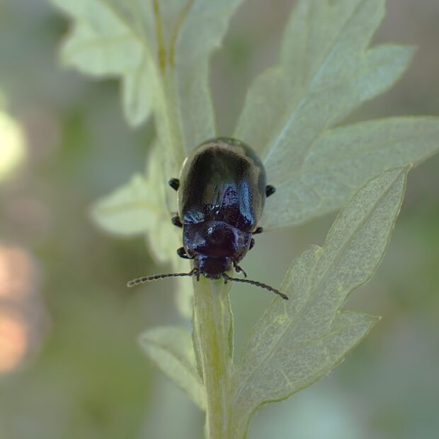 草地、 川原などのヨモギで見られる身近なハムシ。 光沢があり、 体色は青藍色と銅色の2つのタイプがいます。 よく歩き回り、 あまり飛びません。 成虫または卵で越冬します。