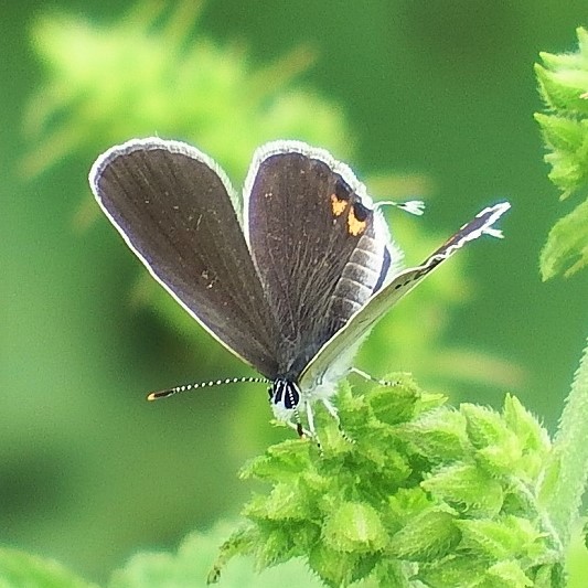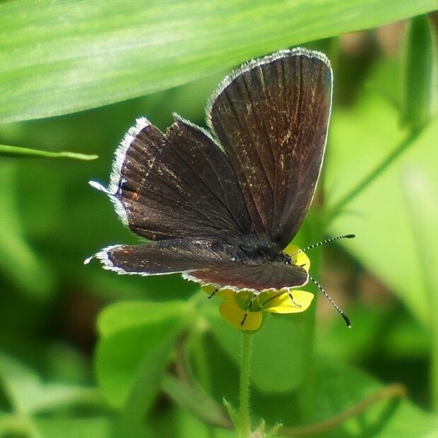裏ばねは白っぽくオレンジ色の紋がある小さなシジミチョウ。 後ばねにしっぽのような尾状突起があることから、 「ツバメ」と名づけられました。 オスの表ばねは青色、 メスは黒っぽいです。 明るい草地、 公園などで普通に見られます。