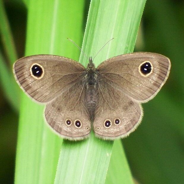 裏ばねが波模様で、 目玉模様(眼状紋)があるタテハチョウの仲間。 明るい草地でフワフワ飛んでいる姿を普通に見ることができますが、 都市部では減少しています。 よく花を訪れます。 (MT)