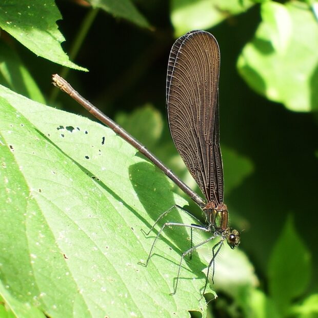 薄暗い所で見られるカワトンボの仲間。 細長い体をしており、 腹部は、 オスは金緑色、 メスは黒褐色です。 植物が繁茂する穏やかな流れの川、 用水路などで見られます。 未熟なときは、 林のやや薄暗い場所で群れています。