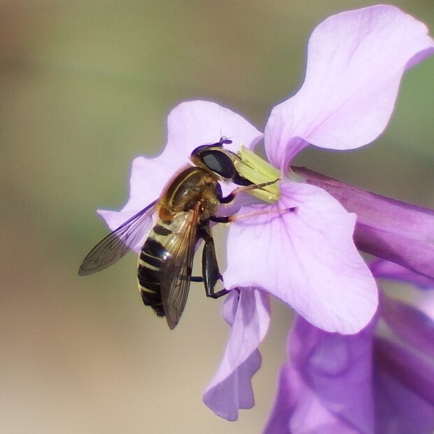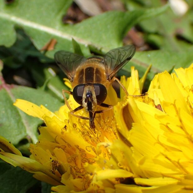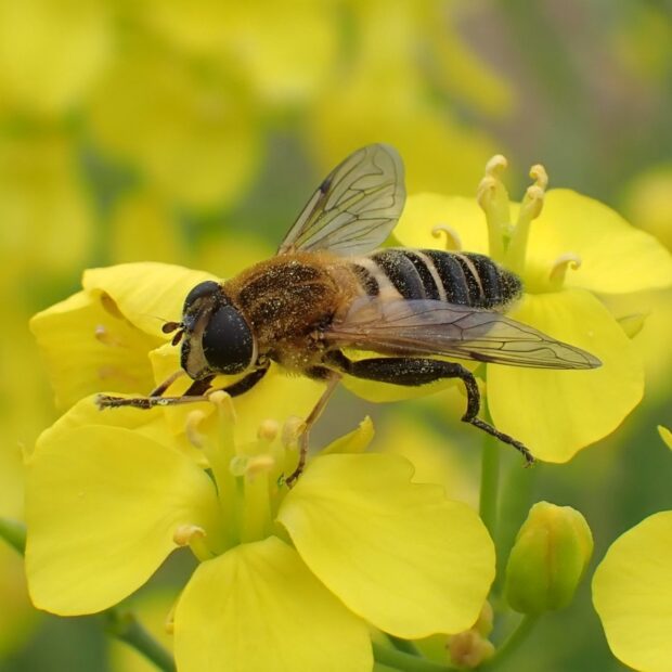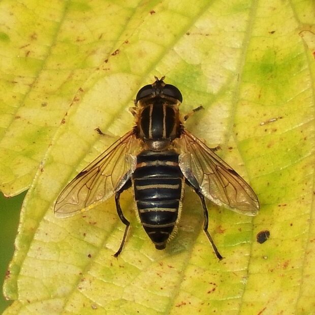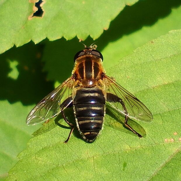 胸にたて筋があるハナアブ。 あしは黒く、 後あしのももの部分が太くなっています。 都市周辺でも普通に見られ、 いろいろな花にやって来ます。 幼虫は下水管などの水中で育ち、 シュノーケルのような長い呼吸菅をもち「オナガウジ」と呼ばれます。