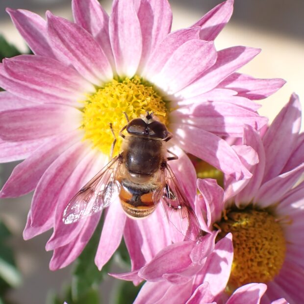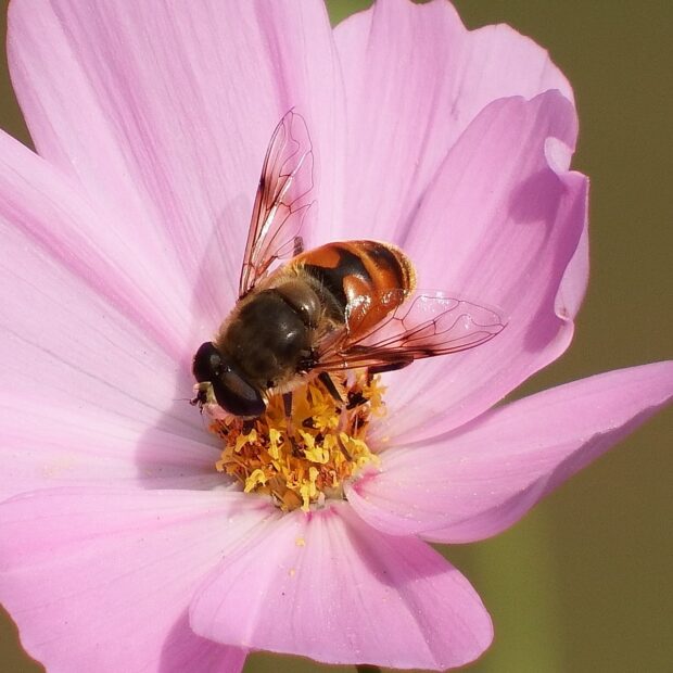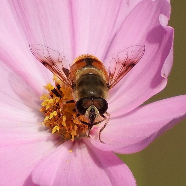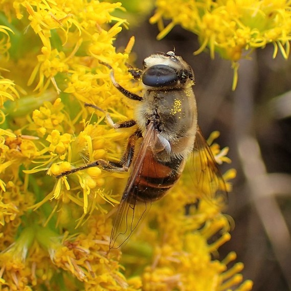 黒とオレンジの大きめのハナアブ。 平地から山地で普通に見られ、 街中の花にもやって来ます。 幼虫は下水菅などの水中で育ち、 お尻にシュノーケルのような長い呼吸管を持つことから「オナガウジ」と呼ばれます。