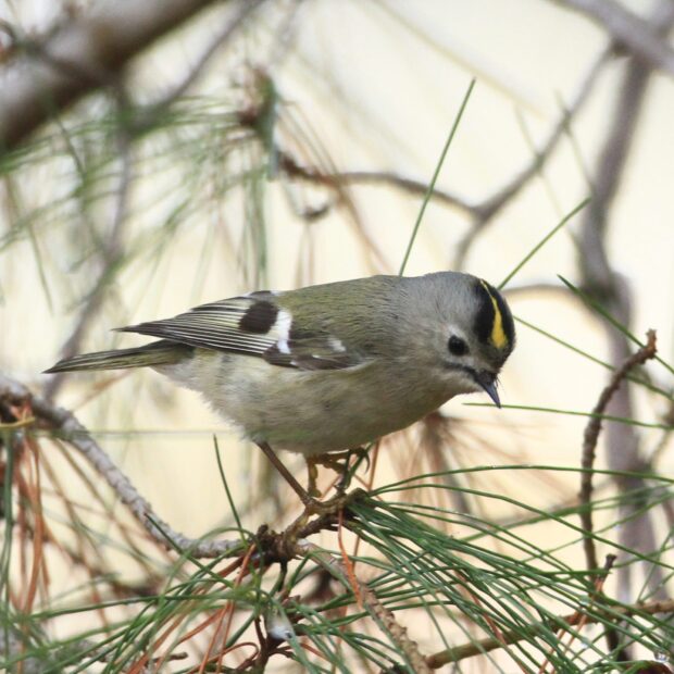 小群で生活することが多いです。 針葉樹にいることが多く素早く動き回るため、 ゆっくり観察するのは難しいです。 オスもメスも頭頂部に黄色い線があり、 オスにはその中に赤い線があります。