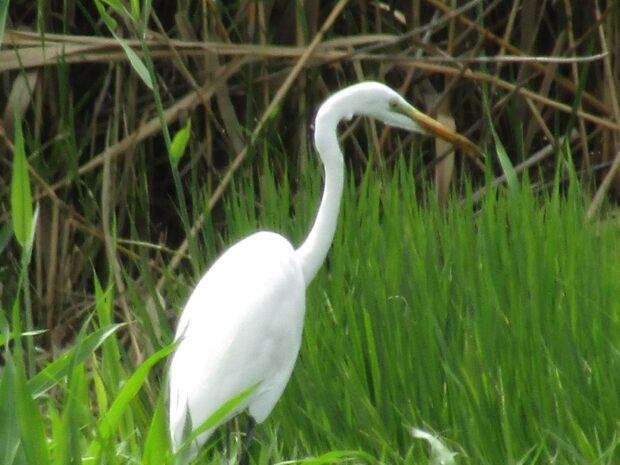 留鳥。 体が灰色で首に黒い縦斑(じゅはん)がある。 水田などの水辺で、 ゆっくり歩きアメリカザリガニ・小魚・ドジョウ・カエルなどをとる。