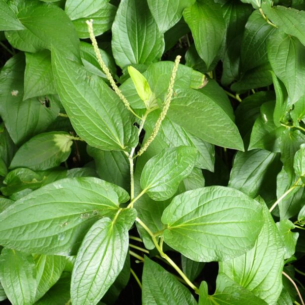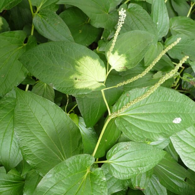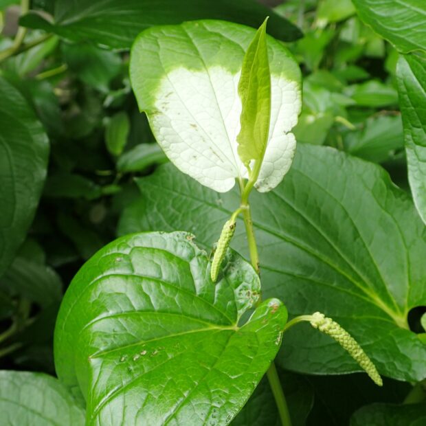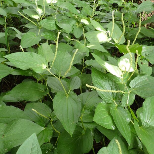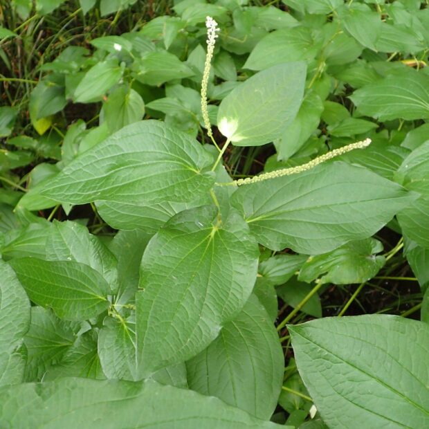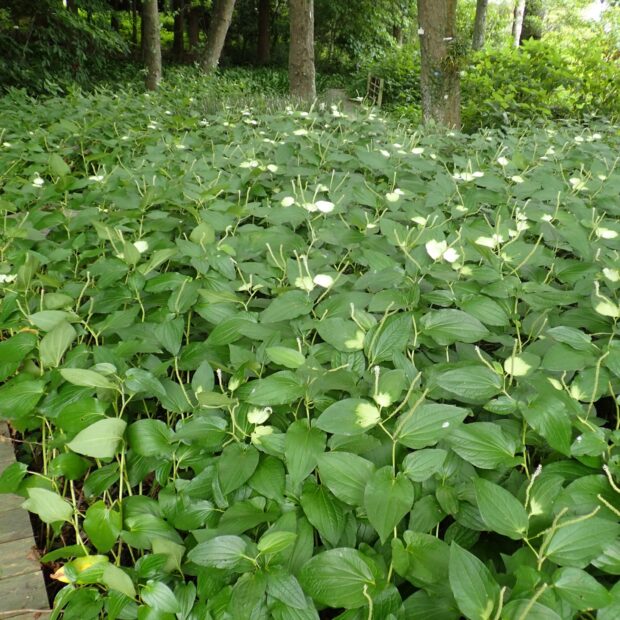 真夏、 花の咲く時に茎の上部の葉っぱが半分白くなる面白い性質があります。 その様子が半分お化粧をしているようなので半化粧と呼ばれるようになったという説もあります。 花が終るとまた葉は緑色になります。 ドクダミの仲間で草全体が臭いにおいがします。