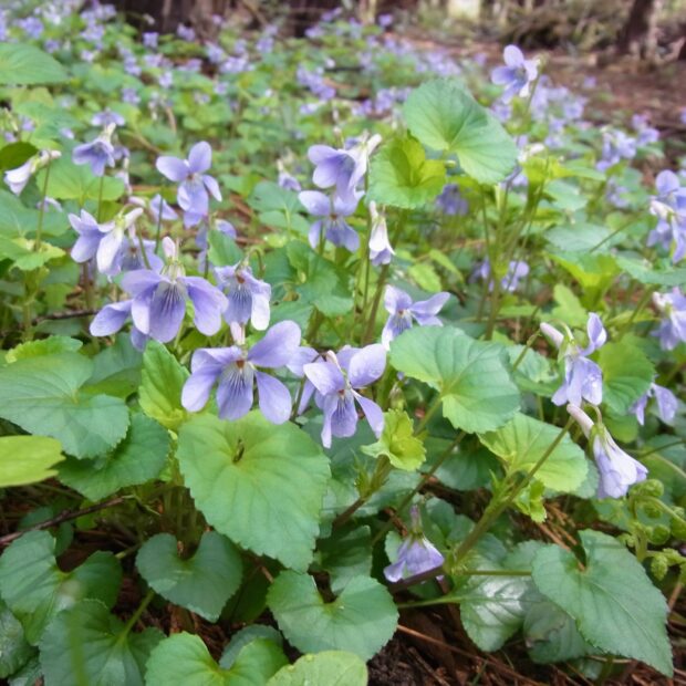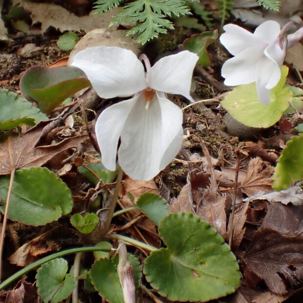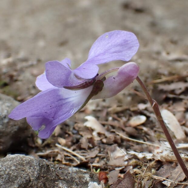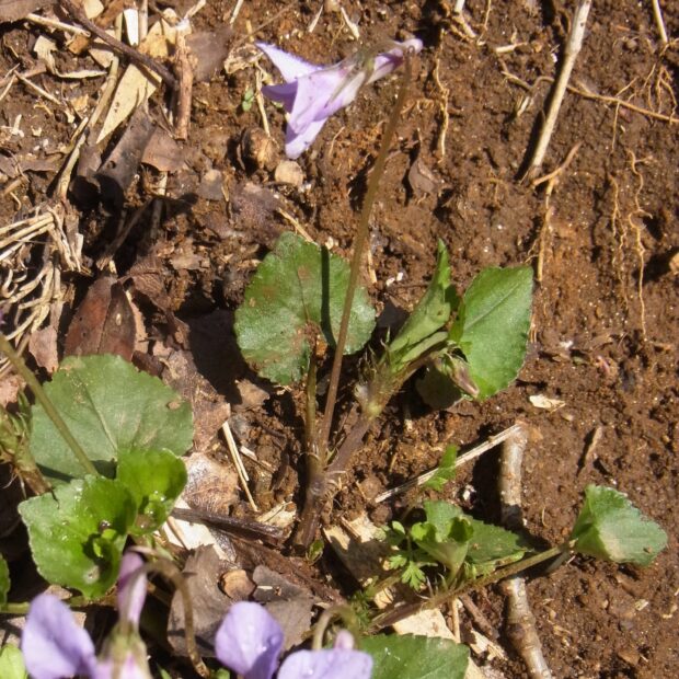 身近で最もよくみられるうす紫のスミレで、 数あるスミレ類のうち日本を代表するスミレと言えます。 スミレ類は地上に茎があるタイプと茎がなくて葉も花も地面から出るタイプに分かれます。 茎から出る葉の基部には托葉(たくよう)という1対の小さな葉がついていて、 その形にも注目です。 (HT)