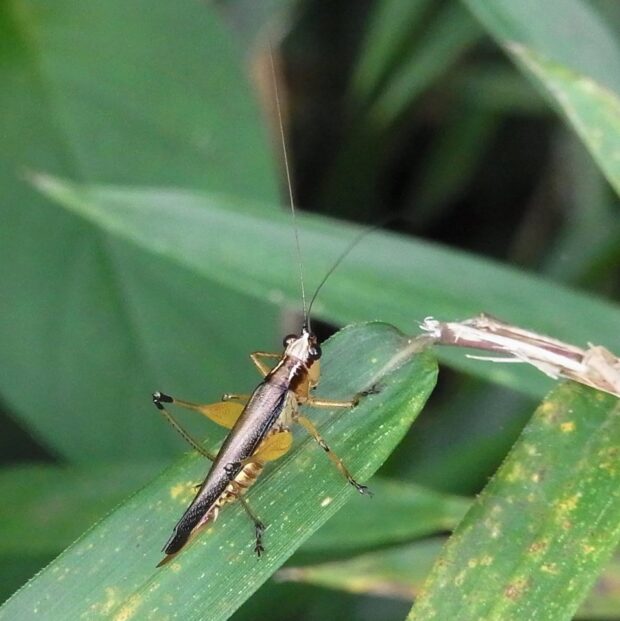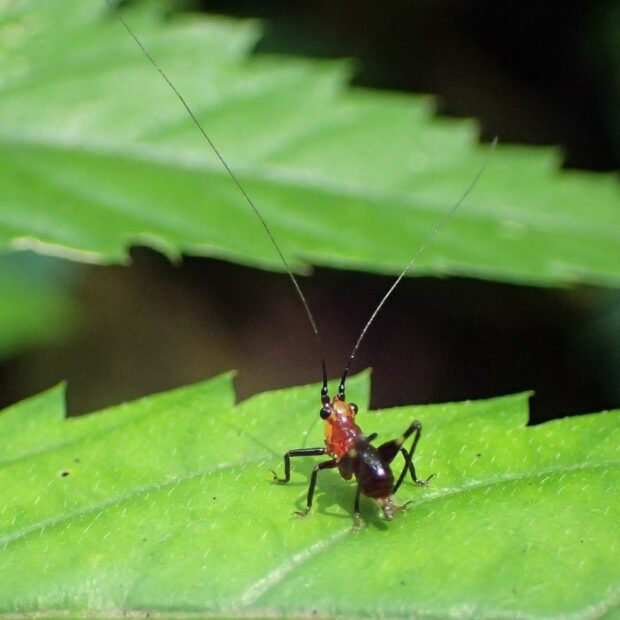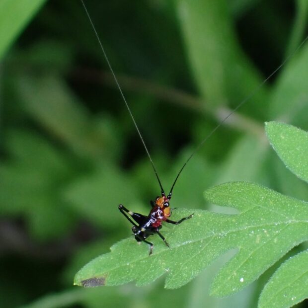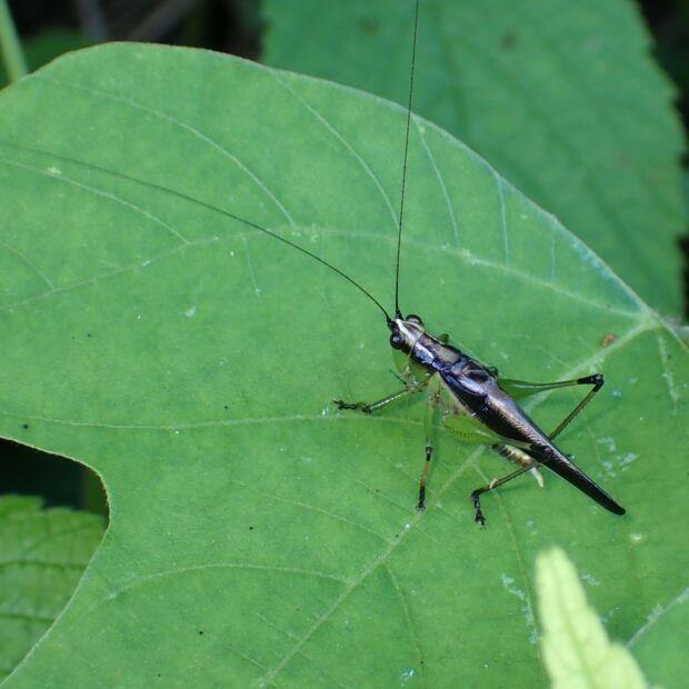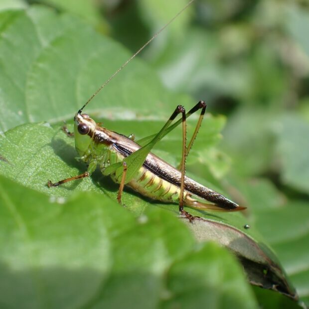 鮮やかな緑色で小さめのキリギリスの仲間。 林縁や草はらで昼間に活動し、 「シリシリシリ・・・」と鳴きます。 小さな幼虫は、 親と違いカラフルでとってもかわいいです。 6月頃にふ化し、 8月頃に成虫になります。
