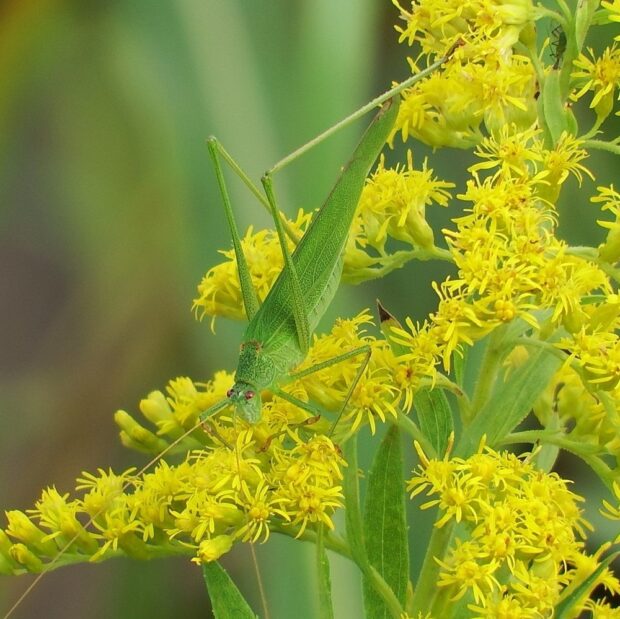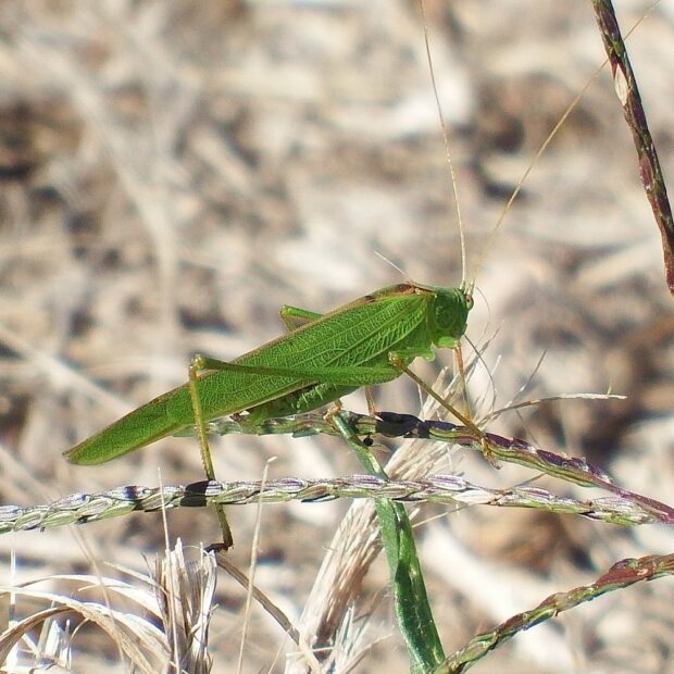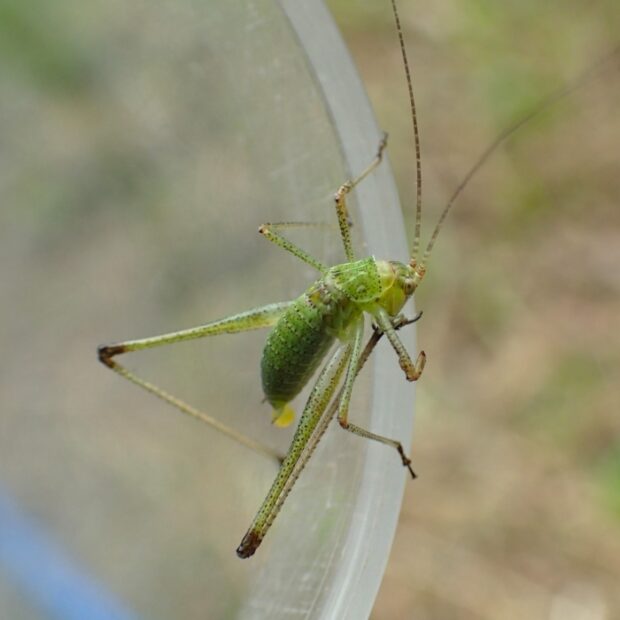 黄緑色のツユムシの仲間。 まれに褐色型も見られます。 「ピチピチ・・・」と、 小さな声で鳴きます。 草はらに多く、 市街地の公園でも見られます。 メスは鎌の刃のような産卵管で草の茎などに卵を産みつけます。