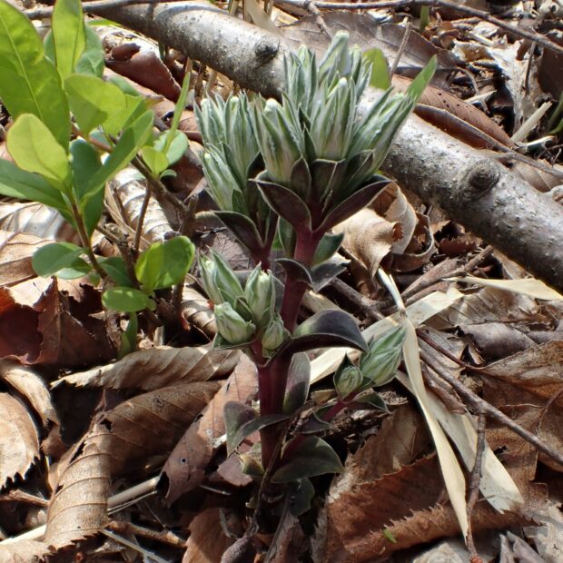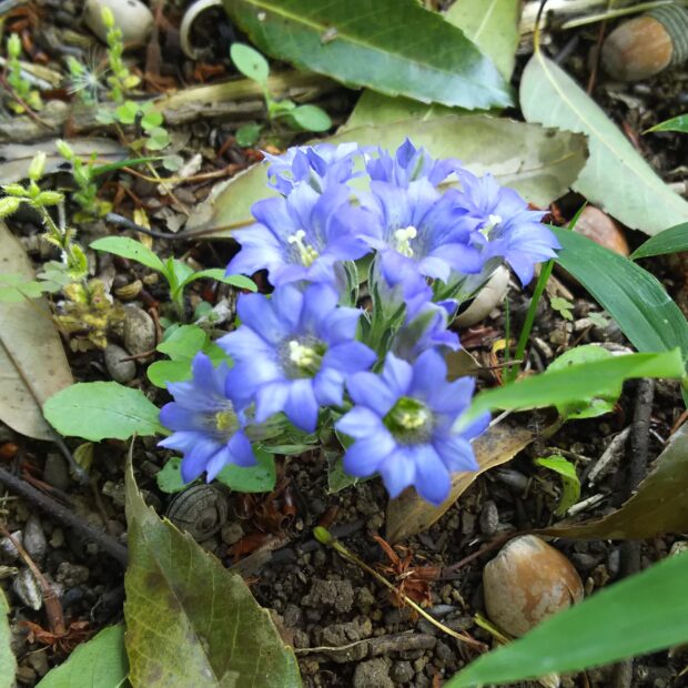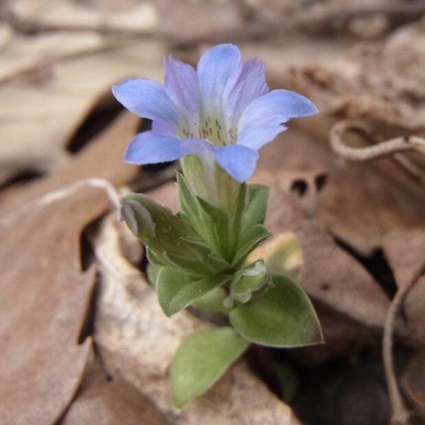 春に日当たりの良い山野で青い花が目を引くかわいいリンドウです。