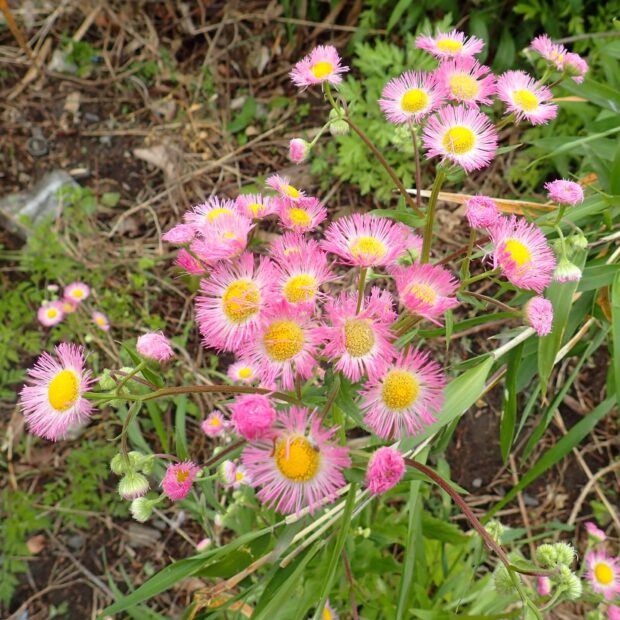 1920年頃観賞用として導入されたものが全国に広がりました。 別名のビンボウギクは手入れされない家の庭に多く見られたこと、 テツドウグサは線路沿いに群生したことなどで呼ばれました。