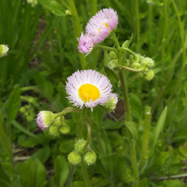 春に咲くキク科の帰化植物でよく似ているハルジオンとヒメジョオンは混同されることが多いのですが、 ハルジオンの方が早く、 早春から咲きだします。 花びら(舌状花)の細さや数、 茎の葉のつき方、 花の時期に根生葉のあるなしなど違いがあるので観察してください。