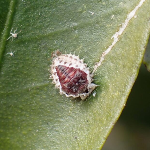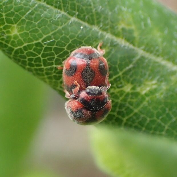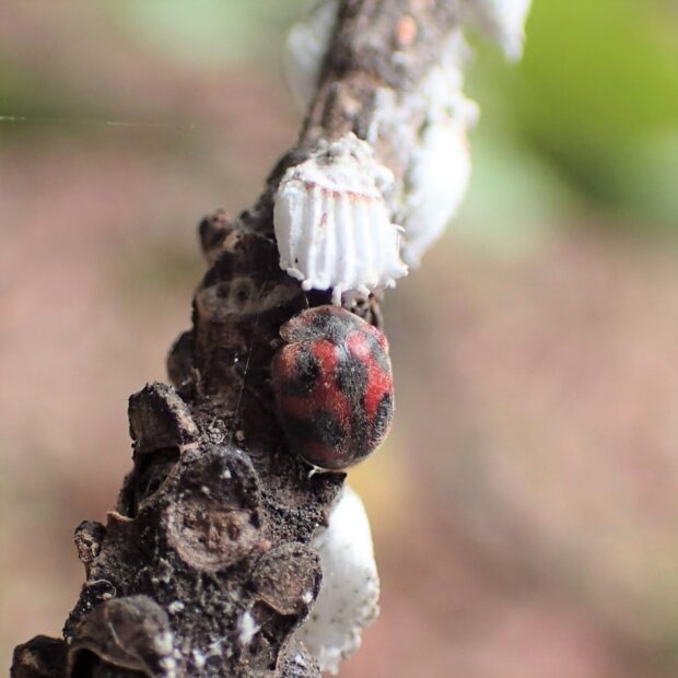 赤いはねに特徴のある黒い紋がある小さなテントウムシ。 1911年、 イセリアカイガラムシを駆除する目的で、 台湾から日本に導入されました。 べダリアテントウは、 一生のうちで200匹ほどのイセリアカイガラムシを食べると言われています。