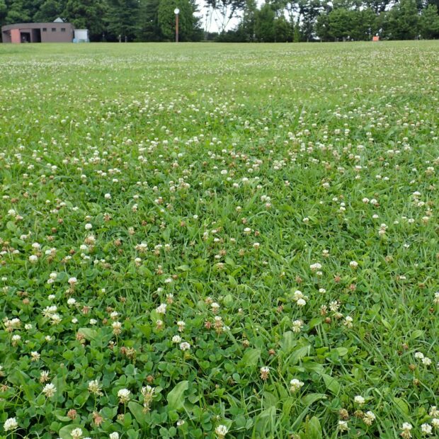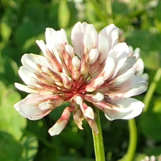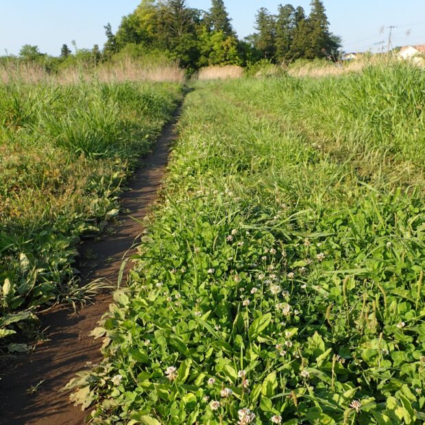 花が一回り大きくて色が赤紫のムラサキツメクサもよく見られます。
