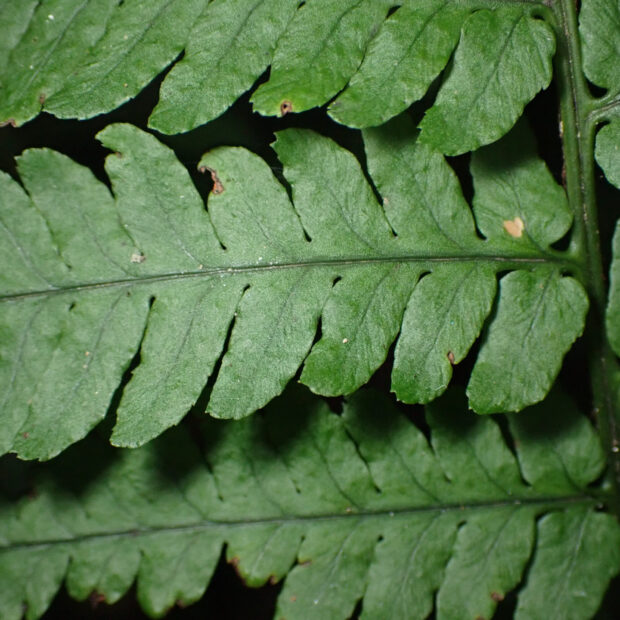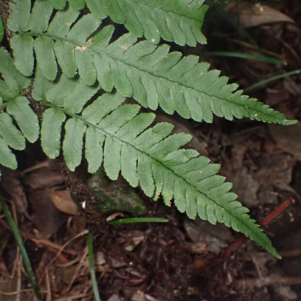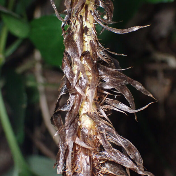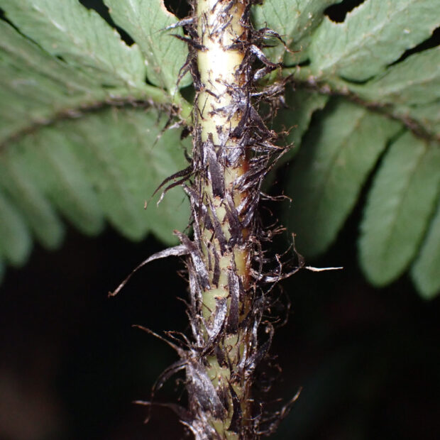 身近なタテ長のシダです。 葉柄に鱗片がたくさんつき、 近縁種のクマワラビよりもこの鱗片が黒っぽいことから雄クマワラビと名付けられました。 とはいえ株によっては茶色っぽいこともあります。