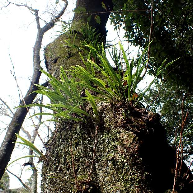 幹に根を張れば、 土が乏しくてあまり大きくなれないものの、 光を独占しやすいという利点があります。 ただし、 幹は雨や風に強くさらされるため、 そこで生き抜くには丈夫でなければなりません。 ノキシノブはその厳しい環境に耐える力を持っており、 その強さが「シノブ(耐え忍ぶ)」という名前の由来になっています。