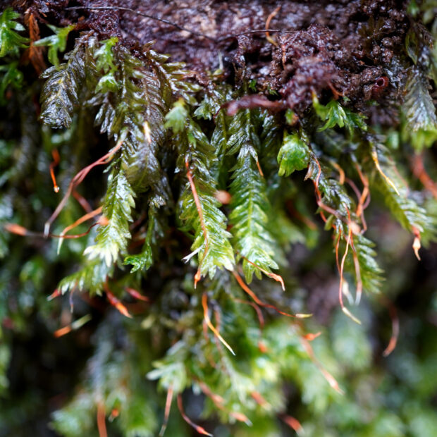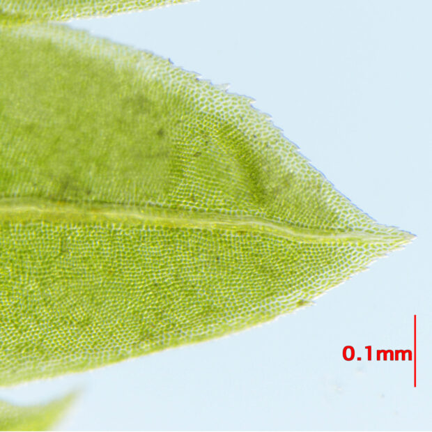 林内に多い身近なホウオウゴケの仲間。 葉先付近のフチに肉眼では見えないほどの小さなギザギザ(鋸歯)があり、 これがニワトリの鶏冠(とさか)に例えられました。