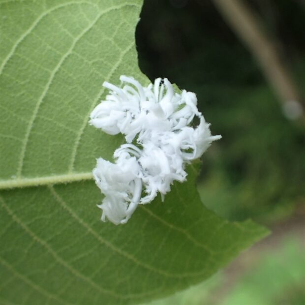 初夏、 オニグルミの葉の裏に白いロウ物質でおおわれたフワフワの幼虫が隠れています。 ハバチは幼虫(いもむし)が葉を食べる原始的なハチ。 葉を食べて大きくなった幼虫は、 土の中に潜って繭を作ります。 (MT)