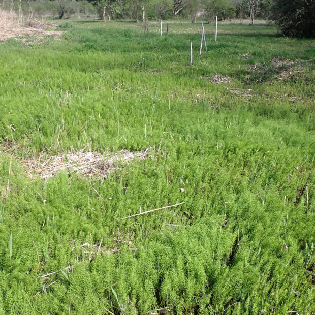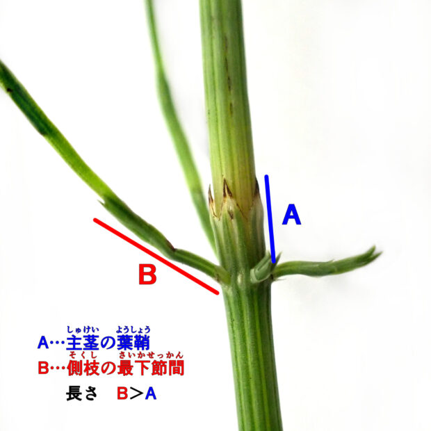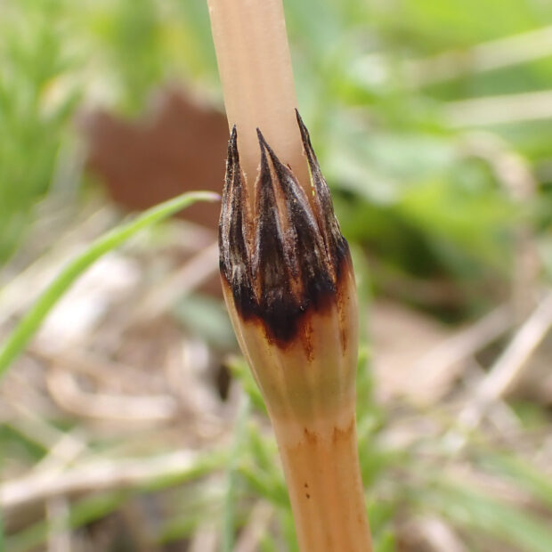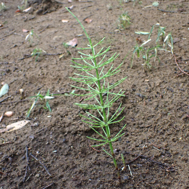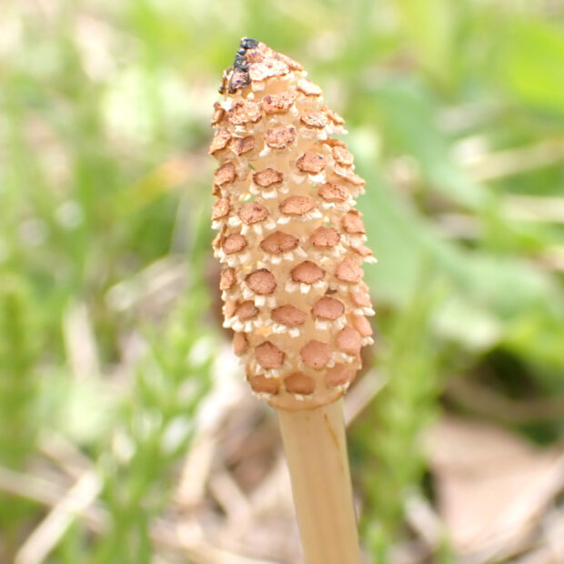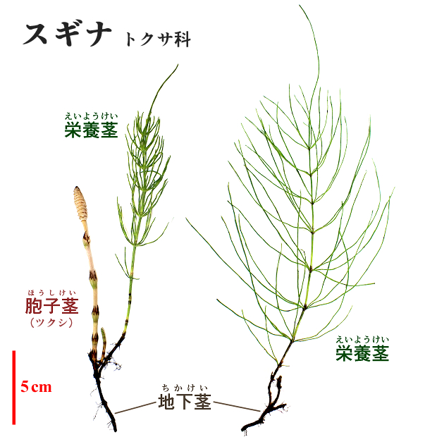道ばたにごく普通に生えているシダ植物。 緑色のいわゆる”スギナ”は光合成のみ行う茎、 食用になるいわゆる”ツクシ”は胞子を飛ばすのに特化した茎で、 両者は地下茎で繋がっていることから同じ種類です。