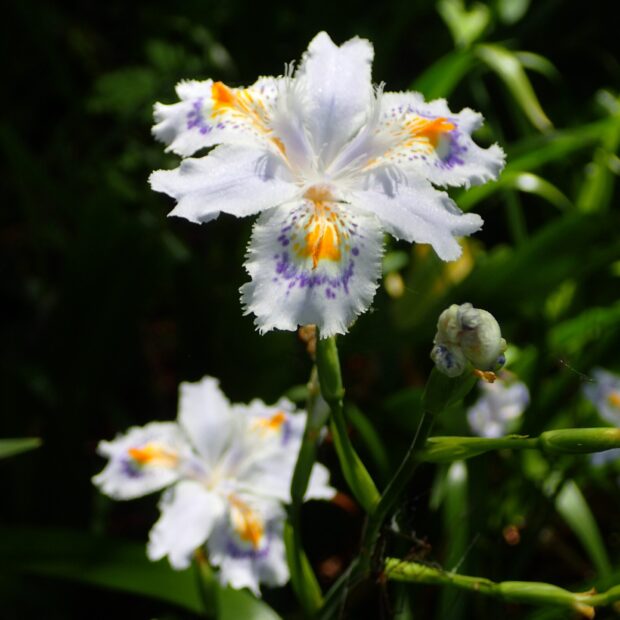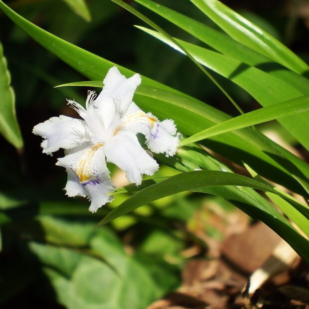 常緑の多年草で中国原産のものが古い時代に渡来して広がったと言われています。 人家に近い湿った林内、 厚く強い光沢のある葉が群生するのがよく見られます。 白い花は暗がりで目立ち、 青や黄色の部分があってきれいです。 日本に生育するものは、 実はなりますが種ができず、 地下茎で増えます。