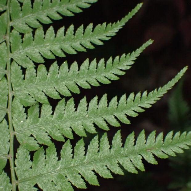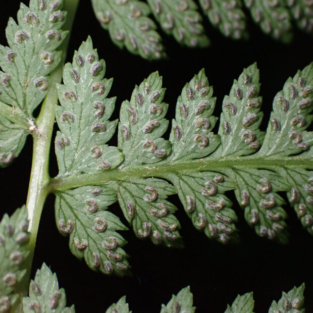 低地から高山まで広く見られるシダ。 葉形は幅広いものから細長いものまでさまざまで、 羽片の切れ込みが鋭く、 葉のやわらかさに反して荒々しい感じがします。 葉裏には小さな胞子のう群が並び、 カマのような形をしています。 葉柄基部には、 中央が栗色でフチが淡色の鱗片が多くつき、 二色のコントラストが際立ちます。