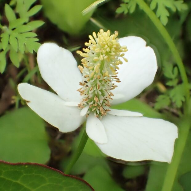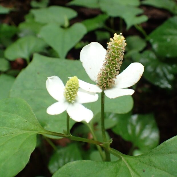梅雨期に群生して咲きます。 白いのは花穂を包む部分(総苞、 そうほう)で、 花びらのない花が花穂に密集しています。 ベトナムでは葉をハーブとして生食し、 中国四川省などでは根を食材として利用します。 (HT)