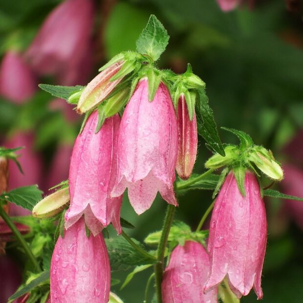 花は赤紫色、 淡紅色、 白色など多様で、 釣り鐘型をしていて先が5つに分かれています。