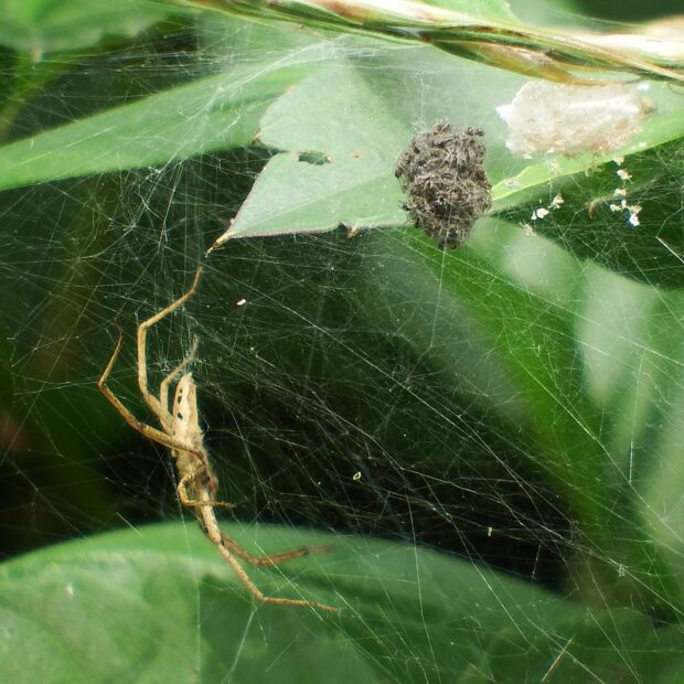 網を張らず歩き回って獲物を探すキシダグモの仲間。 頭胸部の先端がとがるのが特徴で、 色や模様はいろいろです。 クモとしては珍しく、 オスはメスに糸で包んだ獲物をプレゼントし、 メスがその獲物を食べている間に交接をします。 成体は初夏に姿をあらわします。