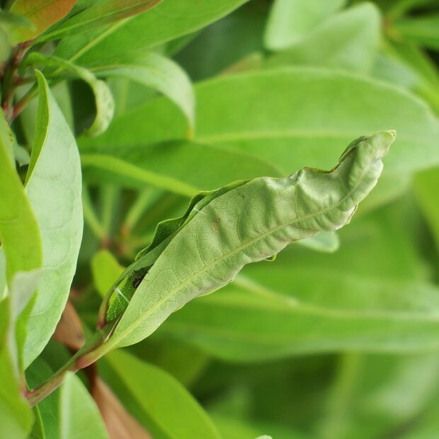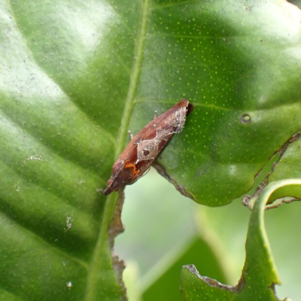 小さなハマキガの仲間。 幼虫は枝先のヤマモモの葉を糸でつづり、 巣をつくります。 幼虫は巣の中で育ち、 蛹になります。 年2回あらわれ、 成虫は、 はねの色や模様が違います。