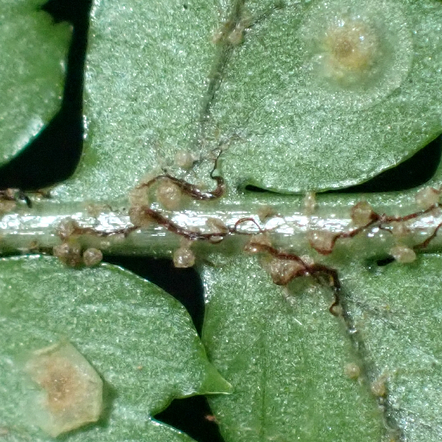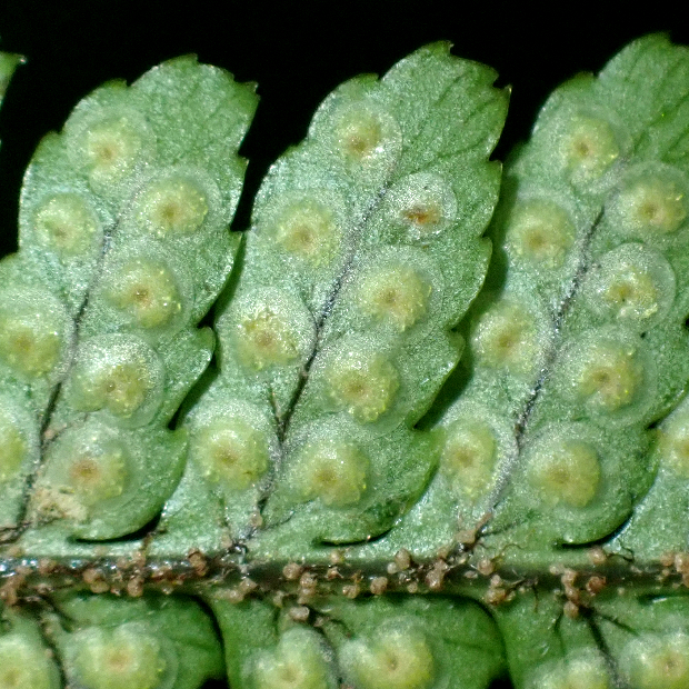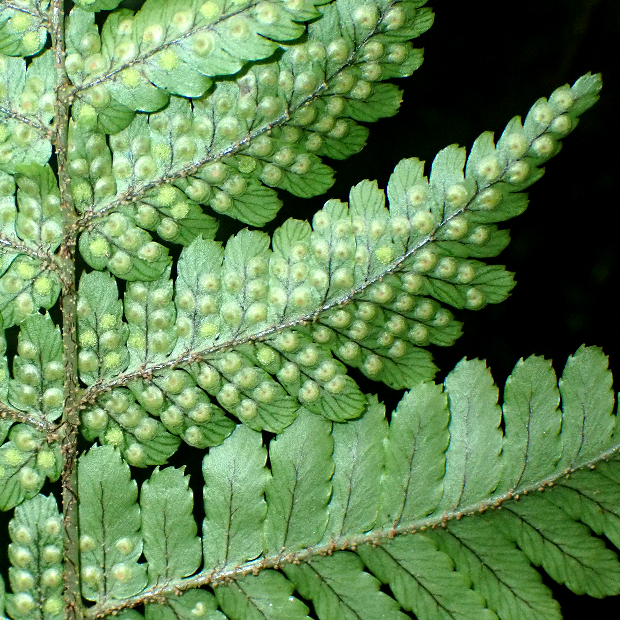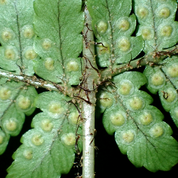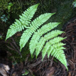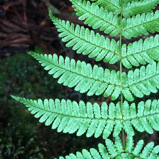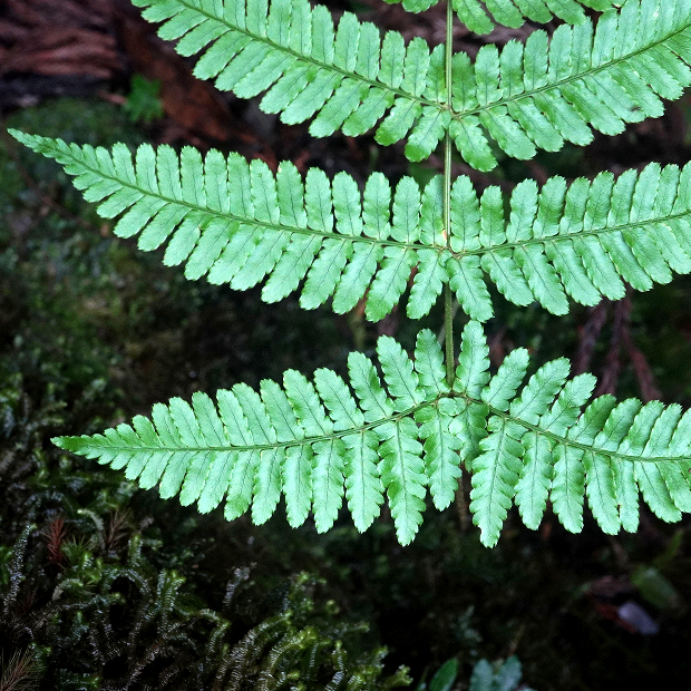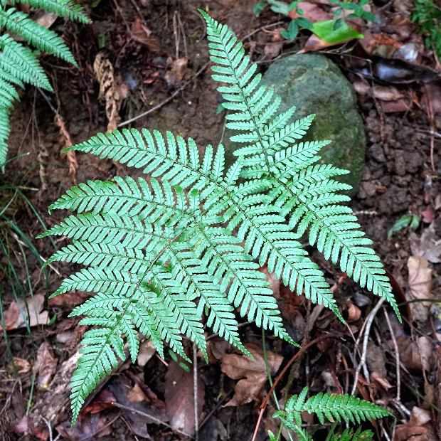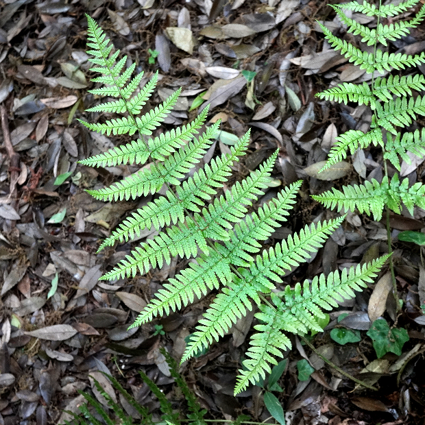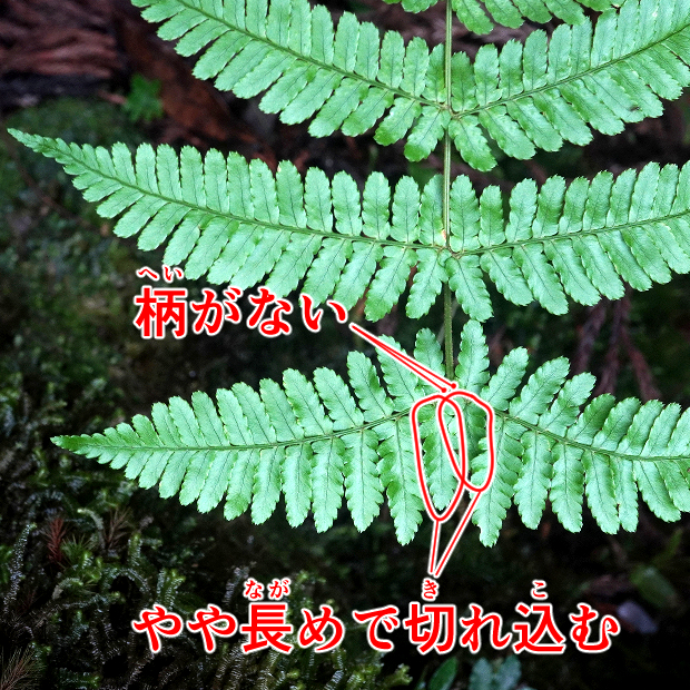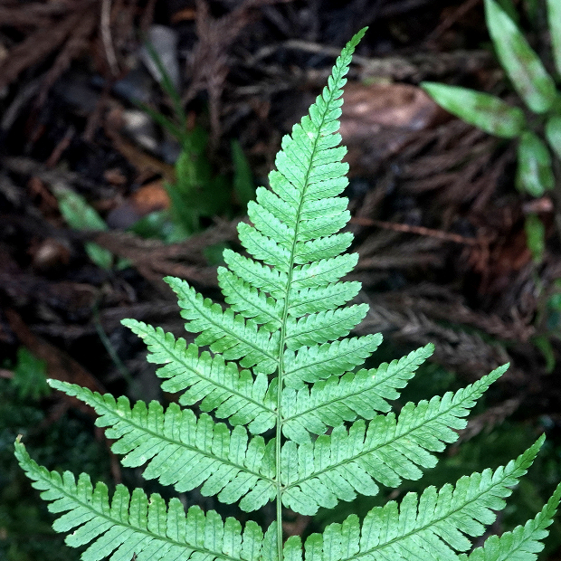 都市公園でもよく見られる身近なシダ。 ベニシダにとてもよく似ていますが、 葉先が急に細くなる、 最下羽片では軸に接する下2本の小羽片が長め、 若葉は紅色にならないなどの特徴があります。