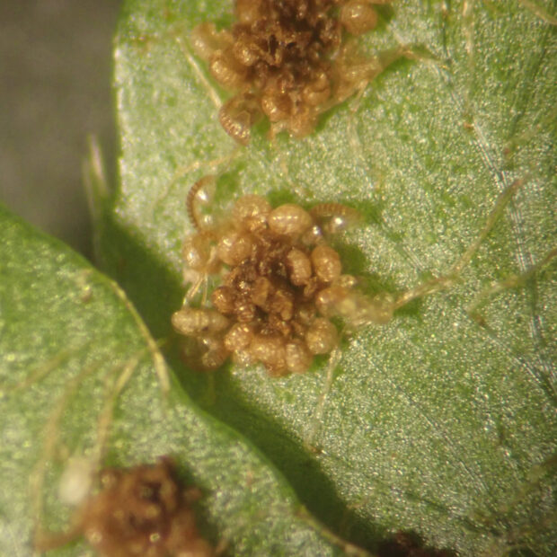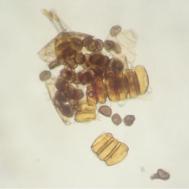 1つの胞子のう群を壊したもの。 この個体のほとんどの胞子のう群中の胞子は正常に発達していなかった。