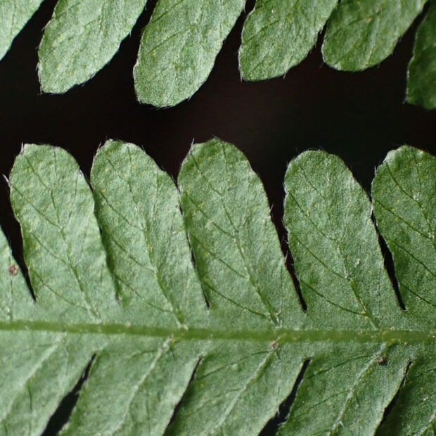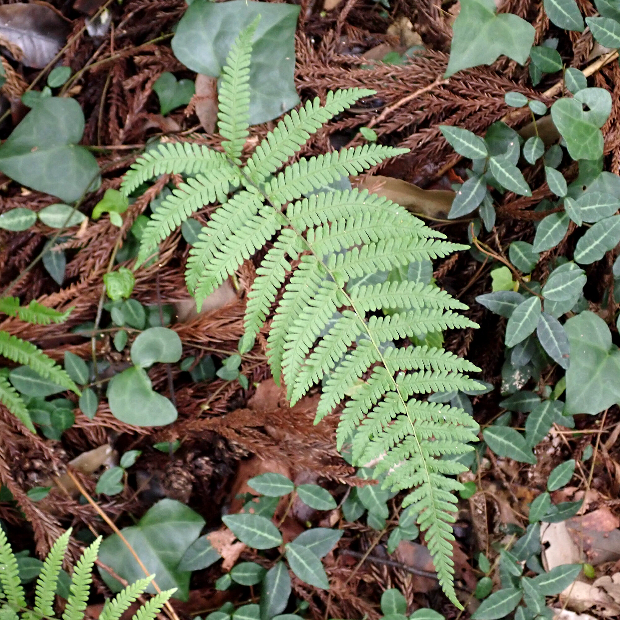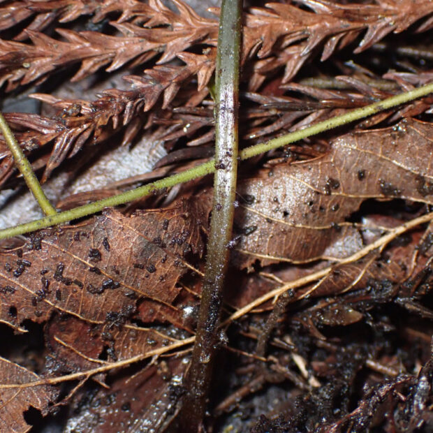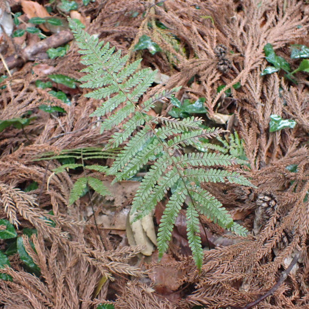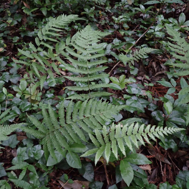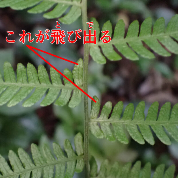 低地の林内でよく見られる小さめのシダ。 葉軸に接する裂片がピョンと飛び出ていることが特徴の1つで、 かわいらしさがあります。 直角近くにつく羽片の感じが梯子(はしご)に見立てられました。