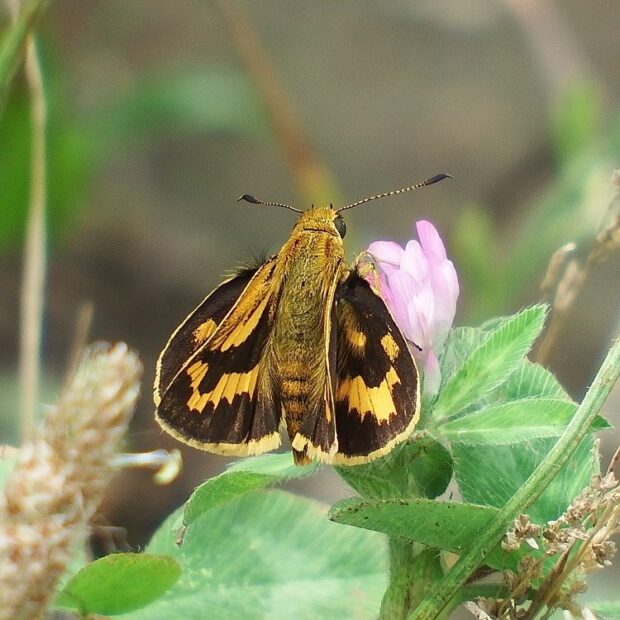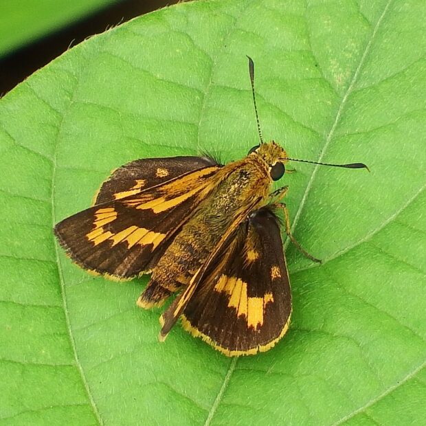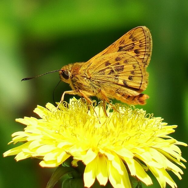 黄色っぽい裏ばねに茶褐色のまだら模様があるセセリチョウ。 敏速に飛び、 いろいろな花を訪れ、 地面で給水も行います。 林縁、 草地、 河川敷など日当たりのいい場所で見られます。 幼虫越冬。