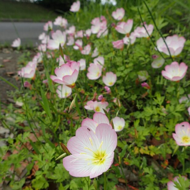 月見草はマツヨイグサ属の植物全般を指す呼び名で、 多くの種が夕方咲いて朝にはしぼむ中で、 日中も咲いているので、 昼咲月見草(ヒルザキツキミソウ)と名付けられました。 淡いピンクの花がきれいで、 鑑賞用に導入され栽培もされており、 野生化も各所で見られます。