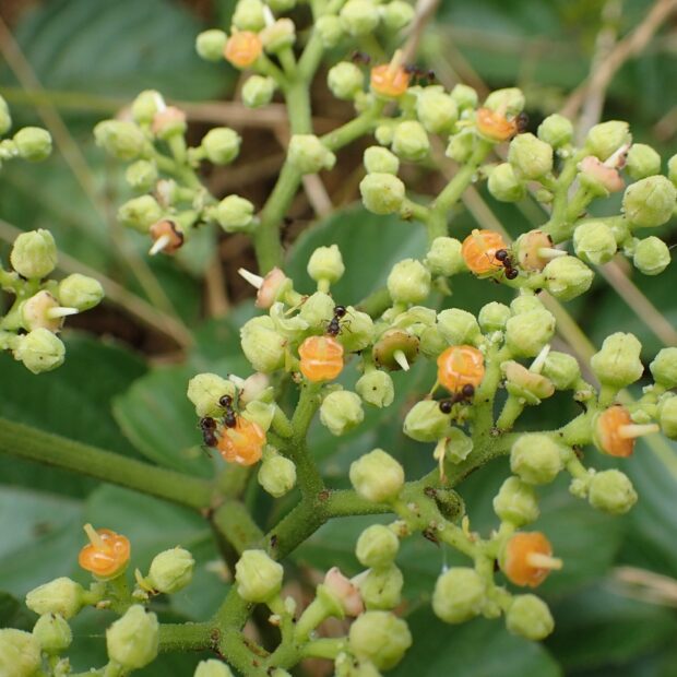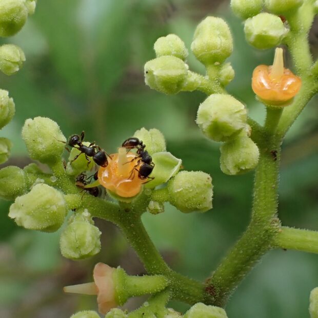花のオレンジ色の部分に蜜が出てきて、 昆虫を引きつけます。