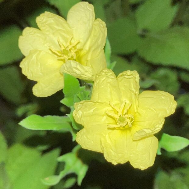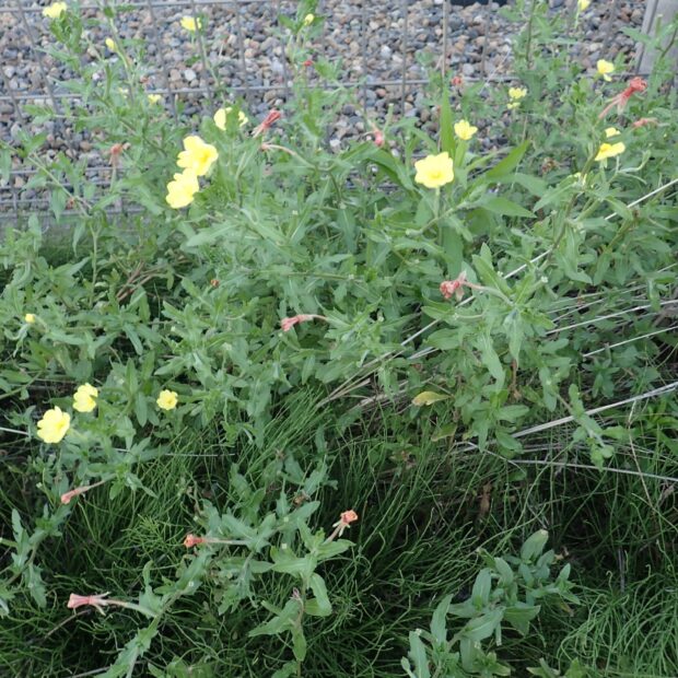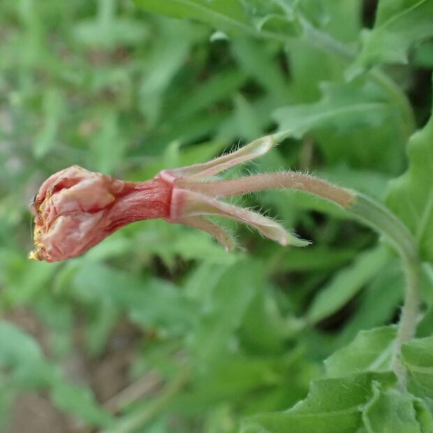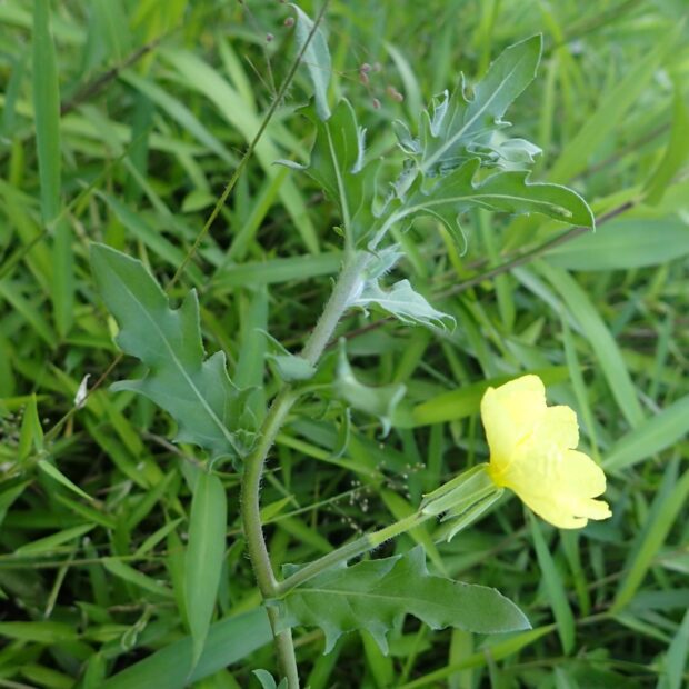マツヨイグサの中では花が小さく、 草丈も低くて地面をはう様に広がります。 草丈が高くなるメマツヨイグサとちがって、 葉が羽状に切れ込むので見分けられます。