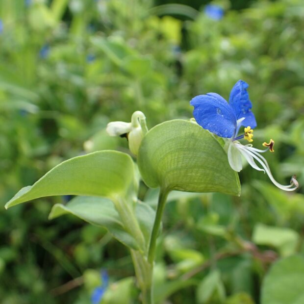 ツユクサ(露草)は、 青い花で衣服に色をつけたことから、 古くはツキクサ(着き草)と呼ばれ、 万葉集にも出てきます。 また、 アオバナ、 ウツシバナ、 ボウシバナなど多くの別名があり、 古くから親しまれてきた夏の花です。