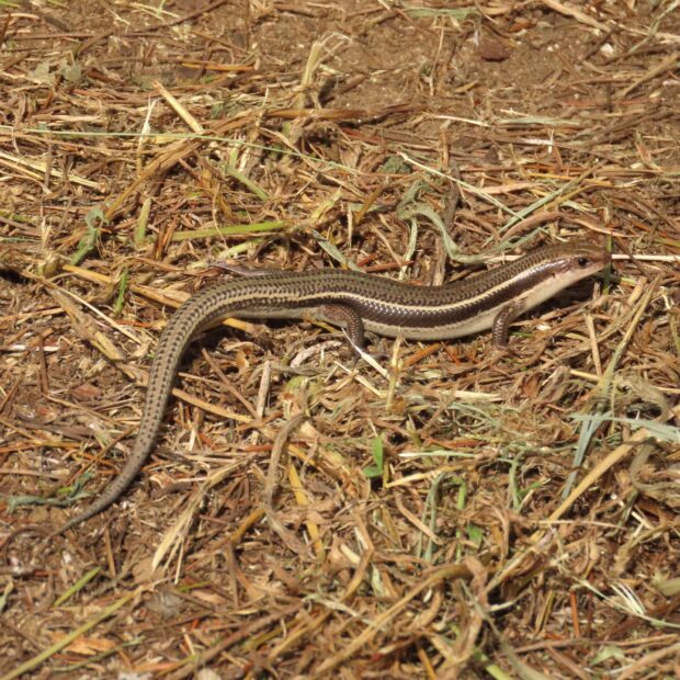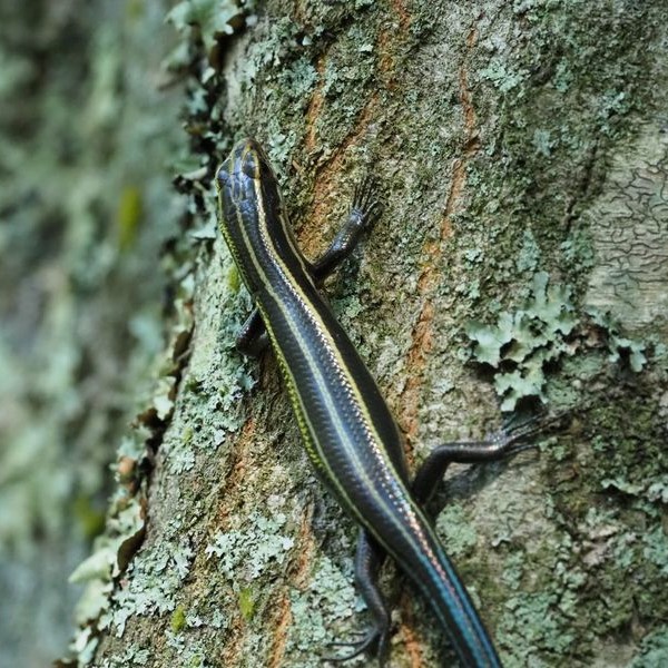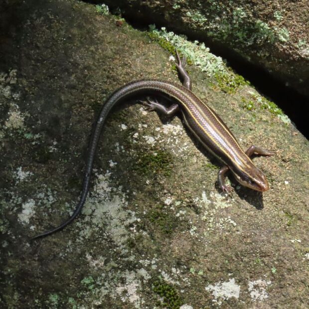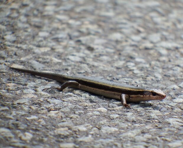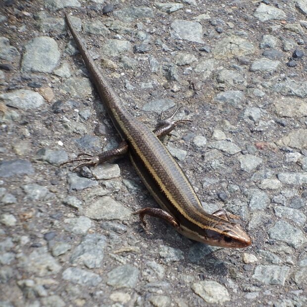 山地から人家の庭まで、 日当たりのいい所で見られます。 危険を感じると自ら尾を切り(自切)ます。 尾は再生しますが、 元通りの骨は形成されません。 西日本に生息するニホントカゲと姿はほとんど変わりませんが、 遺伝子が違い別種になります。 都市近郊では減少しています。