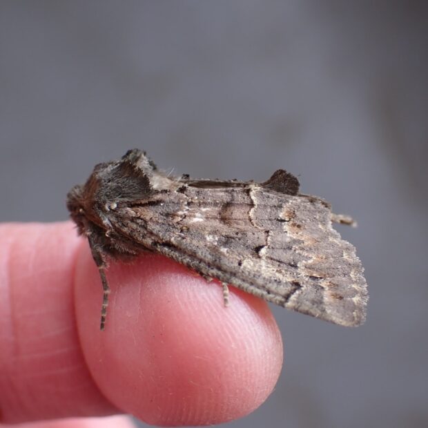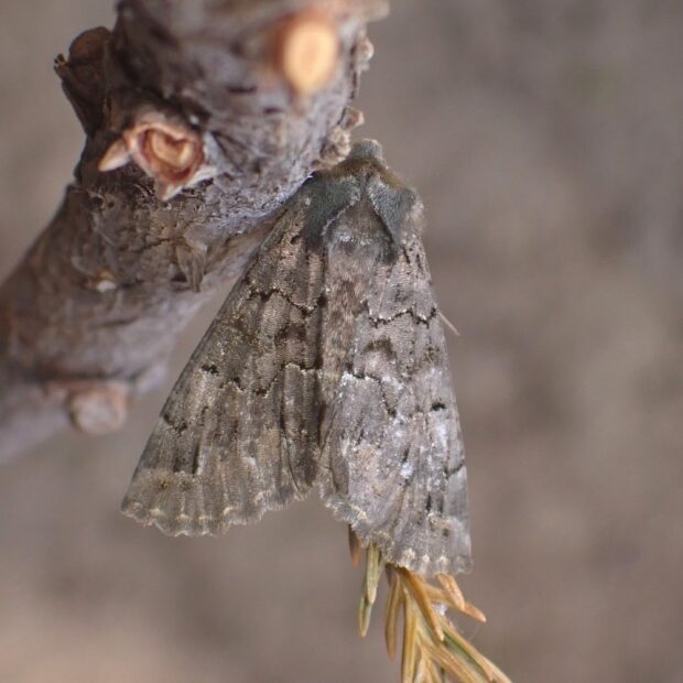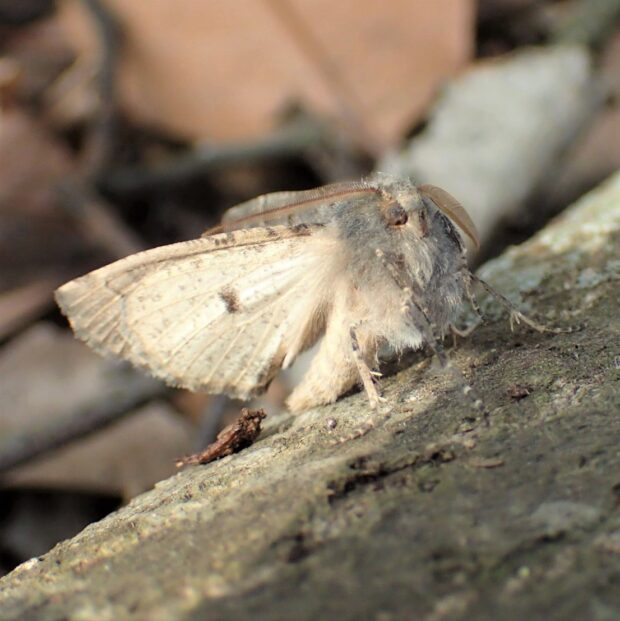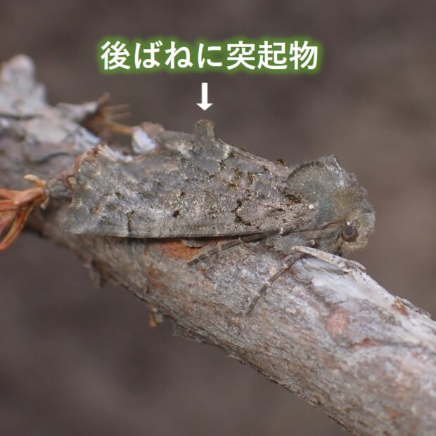 春のガ。 市街地の公園などで普通に見られ、 夜、 明かりによくやって来ます。 はねに線がはいっており、 シワっぽく見えますが、 光が当たるとキラキラ輝きます。 (MT)