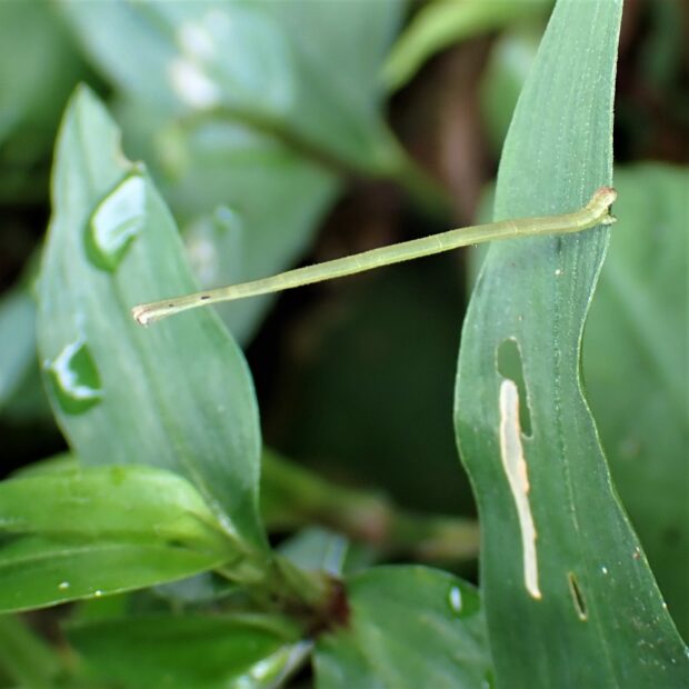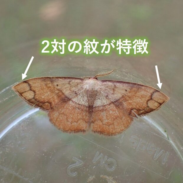 1年に2回、 春と夏に現われるシャクガの仲間。 春型と夏型では模様や色が違っており、 春型の方が一回り大きく、 前後2色に分かれています。 夏型は、 はね全体が赤っぽく小さめです。 市街地の公園などで普通に見られます。