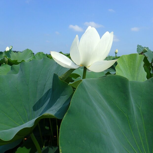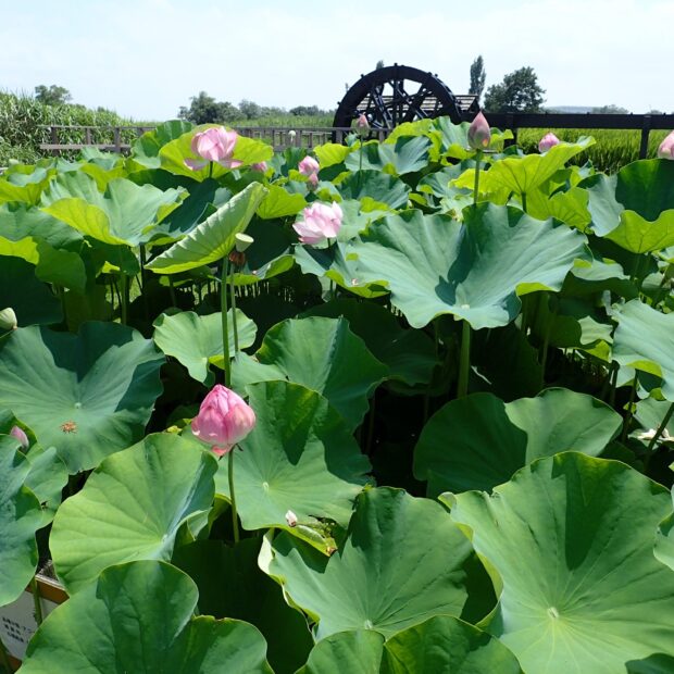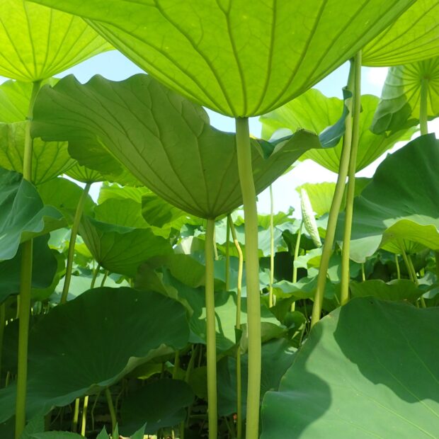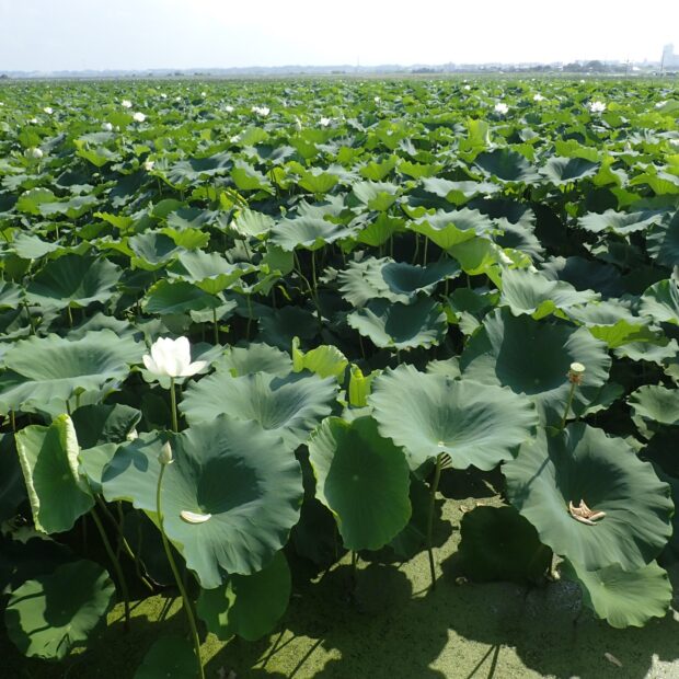 インド原産で古い時代に仏教とともに中国から伝わったと言われています。 池などに観賞用として植えられるほか、 根茎の蓮根(レンコン)を田んぼで栽培しています。 タネの寿命はたいへん長く、 遺跡や古い地層から出てきたハスのタネが発芽して現在によみがえった事例があり、 オオガハスが有名です。 (HT)